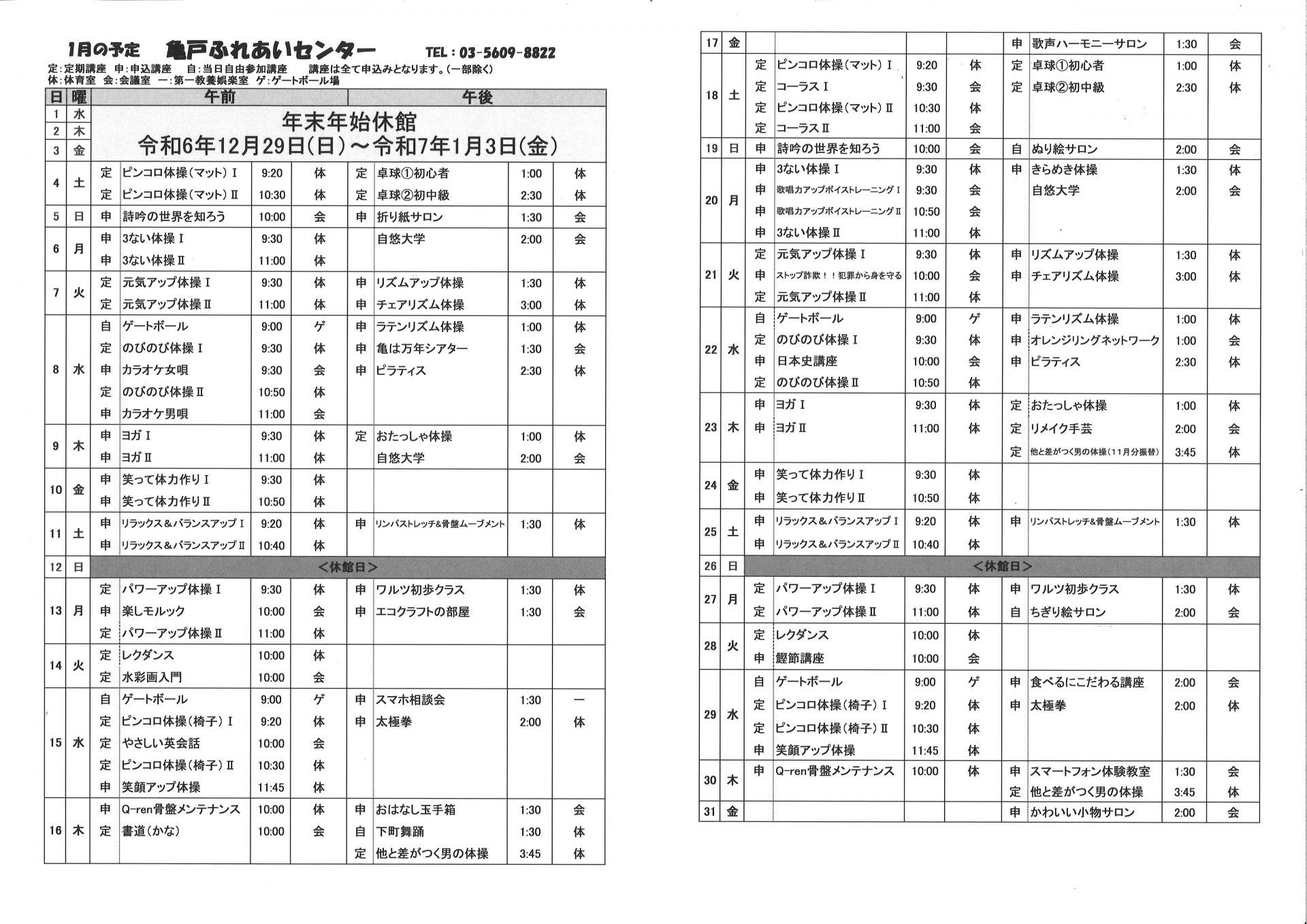 2024.12.23 お知らせ 2025亀戸ふれあいセンター1月号予定表 Tweet シェアする 2025年亀戸ふれあいセンター1月号予定表、完成しました。 前の記事 2024.12.23 お知らせ 2025年亀戸ふれあいセンター1月号おたより 次の記事 2024.12.23 お知らせ 1月前半開催毎回申込講座&3ヶ月講座 当選連絡その2【その他の講座・3ヶ月講座】 一覧へ戻る