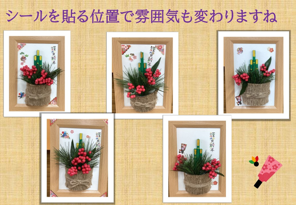 下に樽を貼り、松飾りそして縁起物の千両を飾って、お好みでお正月シールを周りに飾ったら出来上がり!