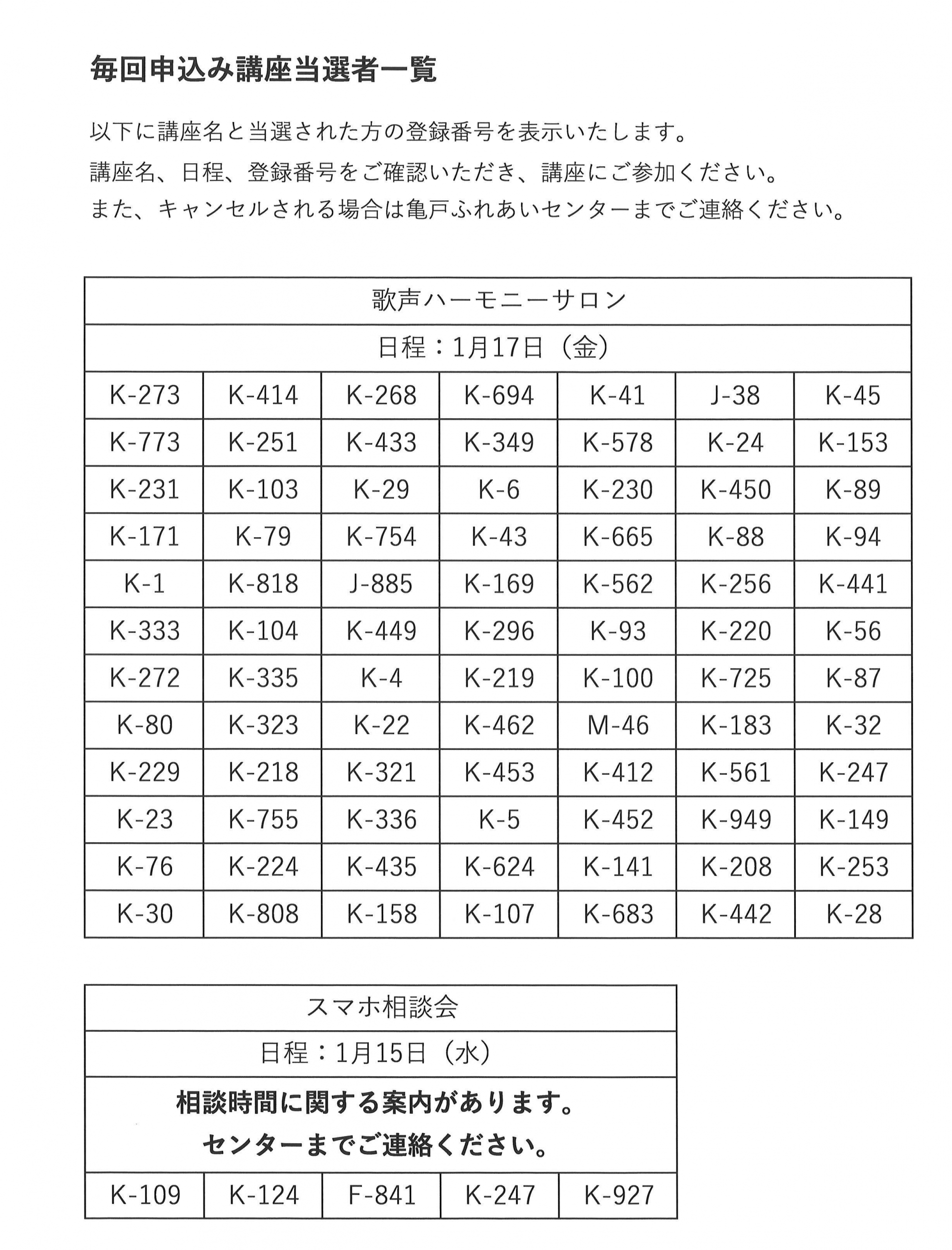 1月後半開催の毎回申込み講座の当選発表をいたします。