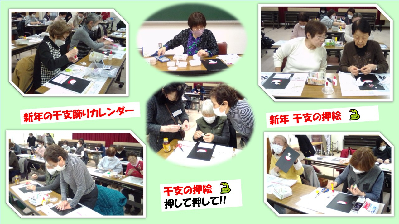 まずは干支の白🐍ちゃんのパーツを番号順に並べて赤い座布団にのせます。出来上がった白🐍ちゃんを黒の台紙の下に入れて上から押して~押して~押絵を整えていきます。整った白🐍ちゃんの口に金運アップの小判をくわえさせて完成です。黒の台紙に張り付け周りを飾り、講師のアイデアでカレンダーを取り付けました。一年間飾ってお楽しみください!完成した皆さんの作品をご紹介いたします。