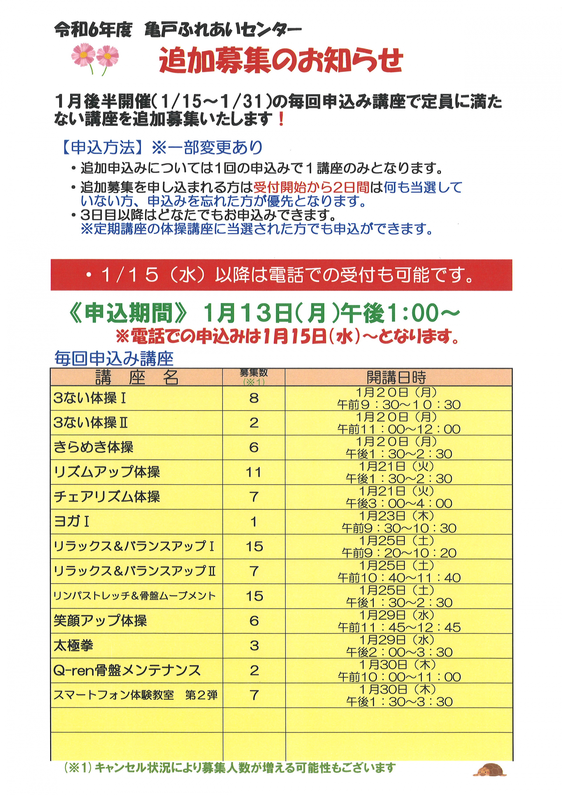 1月後半開催の毎回申込講座で定員に満たなかった講座の追加募集を行います。追加募集する講座は以下の講座になります。