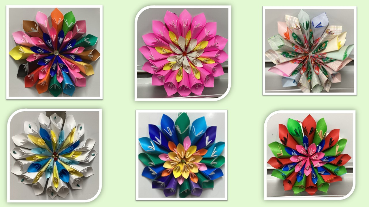 同じ折紙の数、折り方でも配置でかなり雰囲気が変わるんです!今回はパーツも多く、講座時間内に完成できませんでしたが、皆さん素敵なお花の壁飾りが完成しました!完成した皆さんの作品をご覧ください!