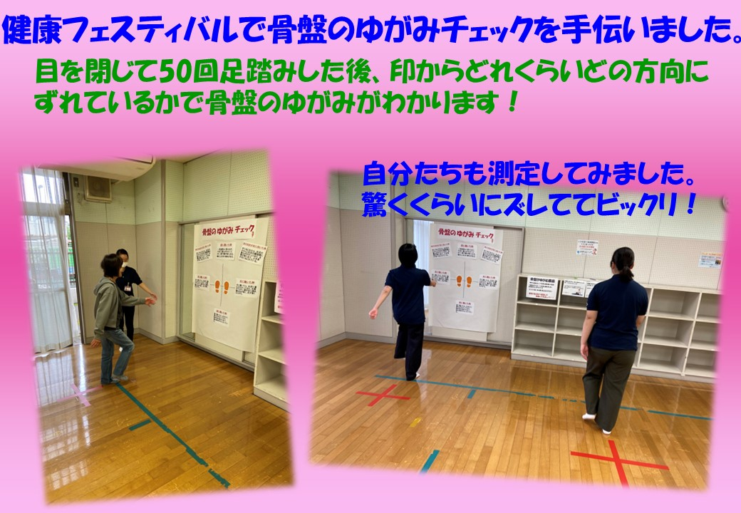 3グループ目となる今回は学生さんには、ちょうどイベントで健康フェスティバルをおこなっていたので、そちらのお手伝いをしていただきました。血管年齢を測定したり、e-sports体験会でボウリングおこなったり、骨盤のゆがみチェックをおこなったりしていただきました。実際に自分たちでも骨盤のゆがみチェックを体験し、思っていた以上に印からズレてしまい、笑うしかなくなっていました(*^-^*)