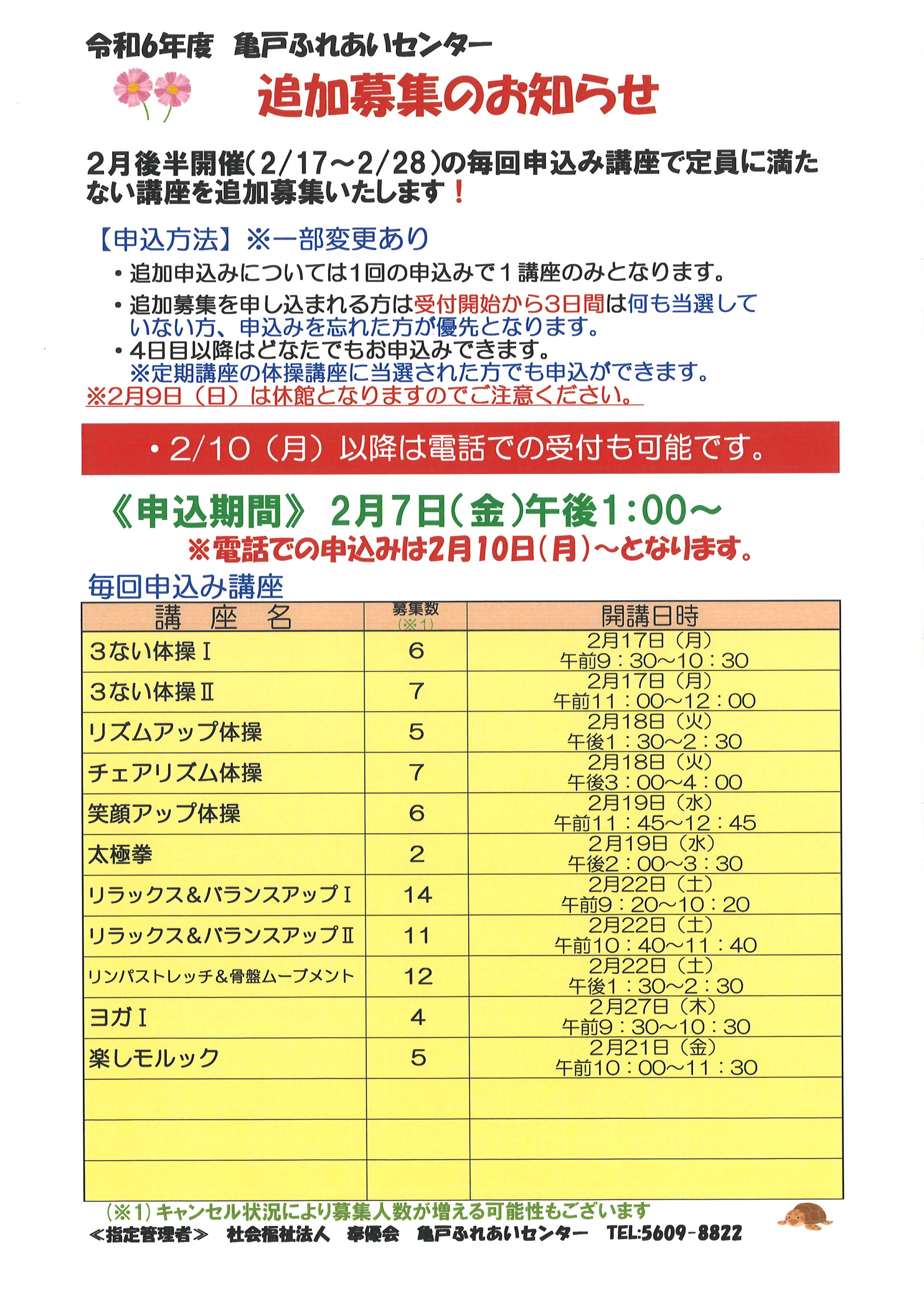 2月後半開催の毎回申込み講座で定員に満たなかった講座の追加募集を行います。追加募集する講座は以下の講座になります。