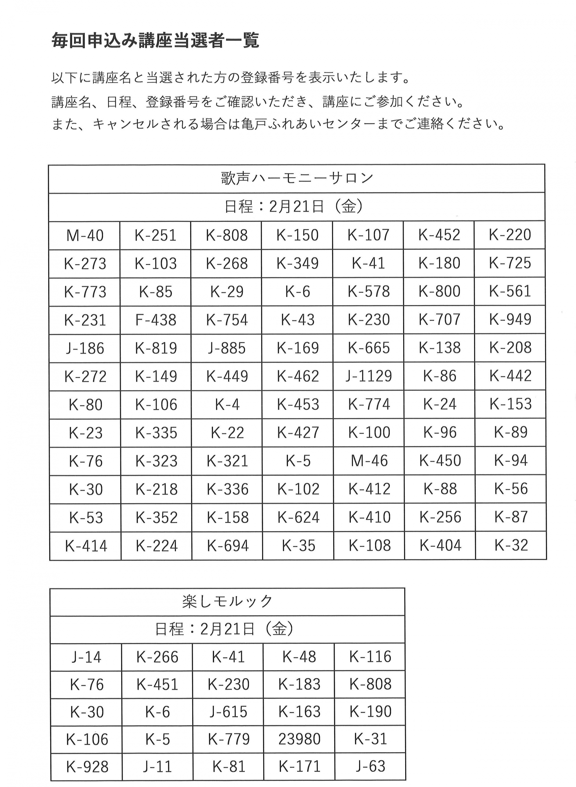 2月後半開催の毎回申込み講座の当選発表をいたします。
