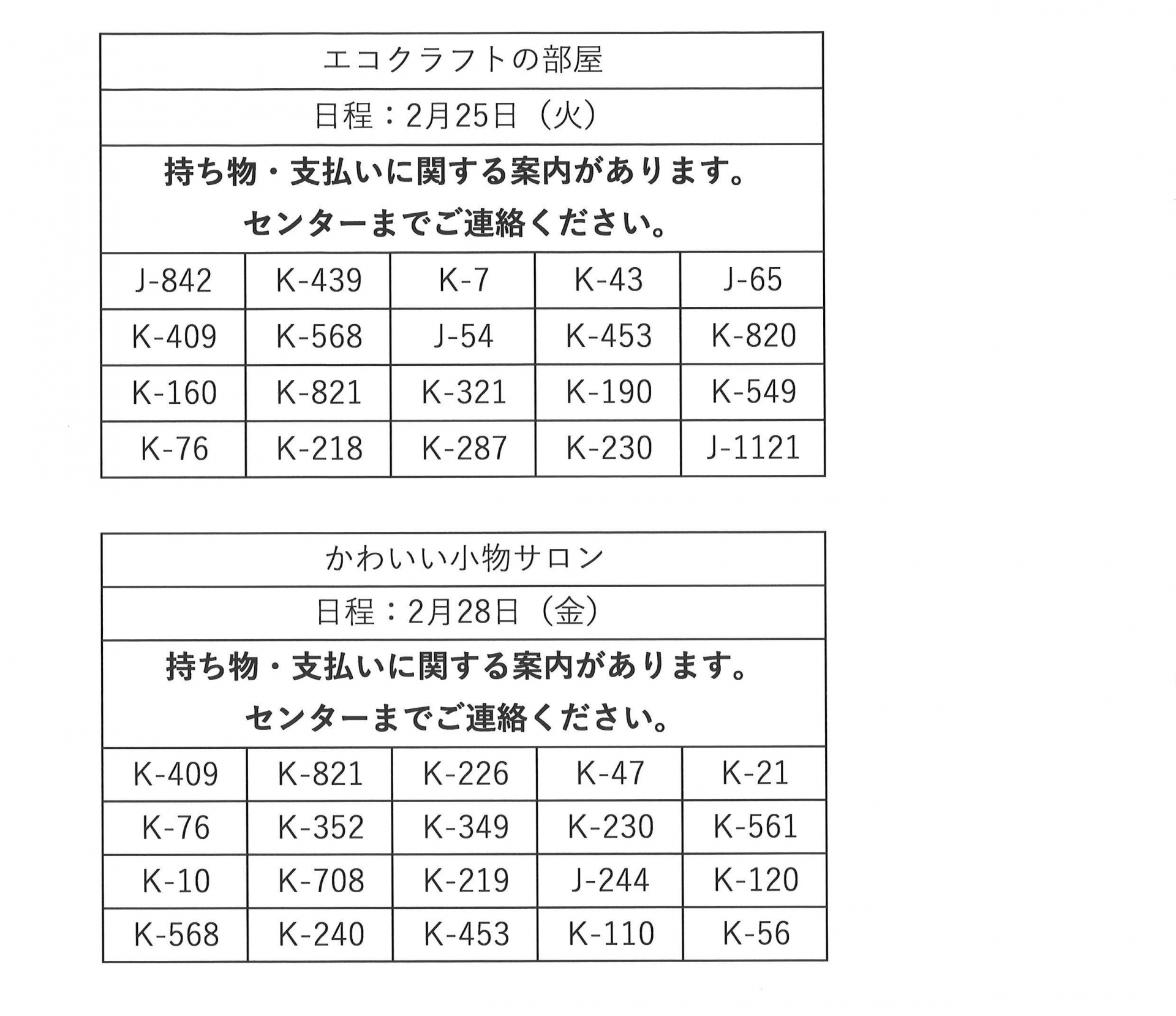 そして、エコクラフトの部屋、かわいい小物サロンに当選された方は持ち物、そして支払いに関するご連絡がございますので、お手数ですがセンターまでご連絡お願いいたします。