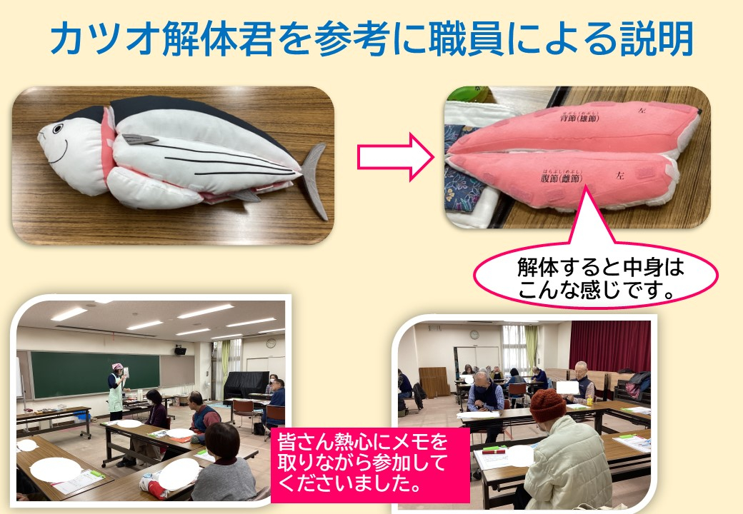 送っていただいた資料を元にセンター職員が、参加者の皆さんに鰹節が出来るまでの工程を、カツオ解体君を使って説明させていただきました。
