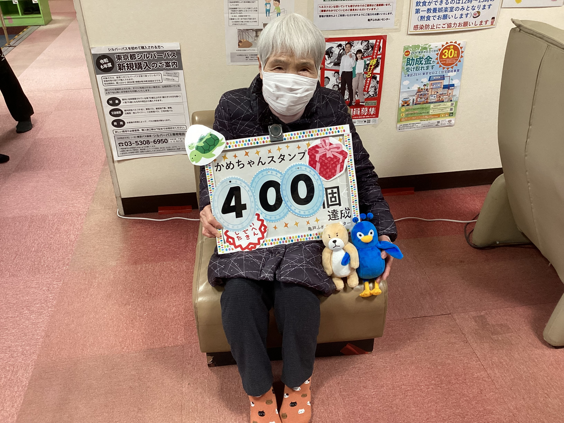 亀戸ふれあいセンター来館時のお楽しみ、かめちゃんスタンプ400個達成しましたN.H様です。