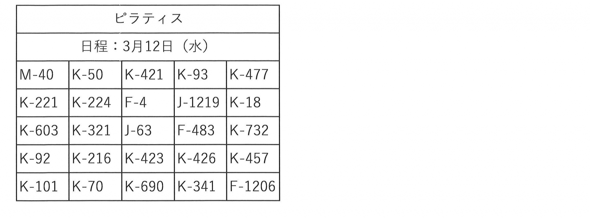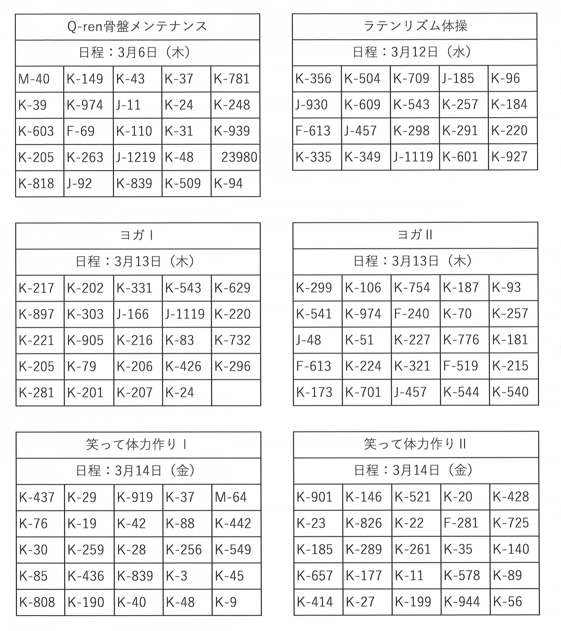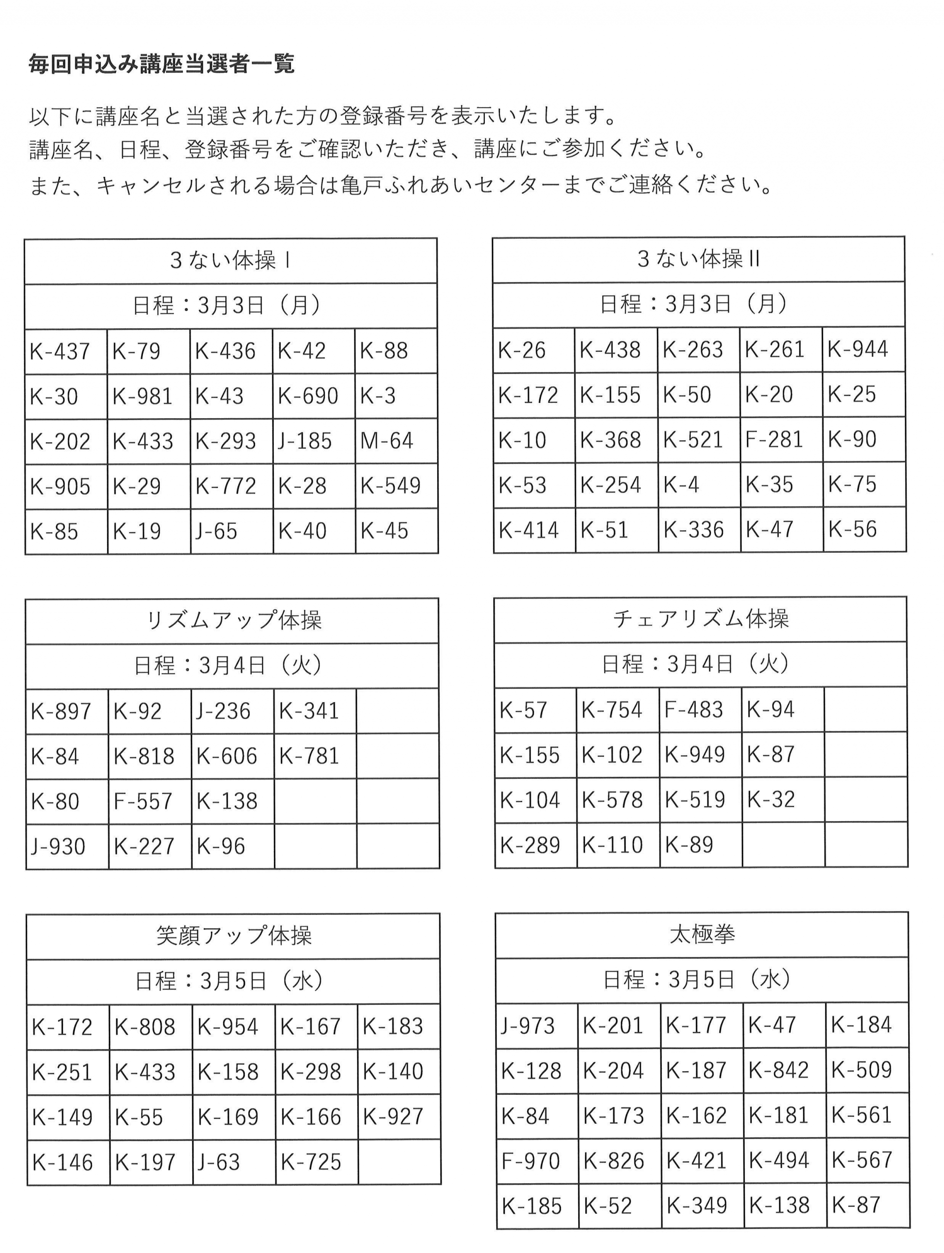 3月前半開催毎回申込講座 当選連絡その1【体操講座】