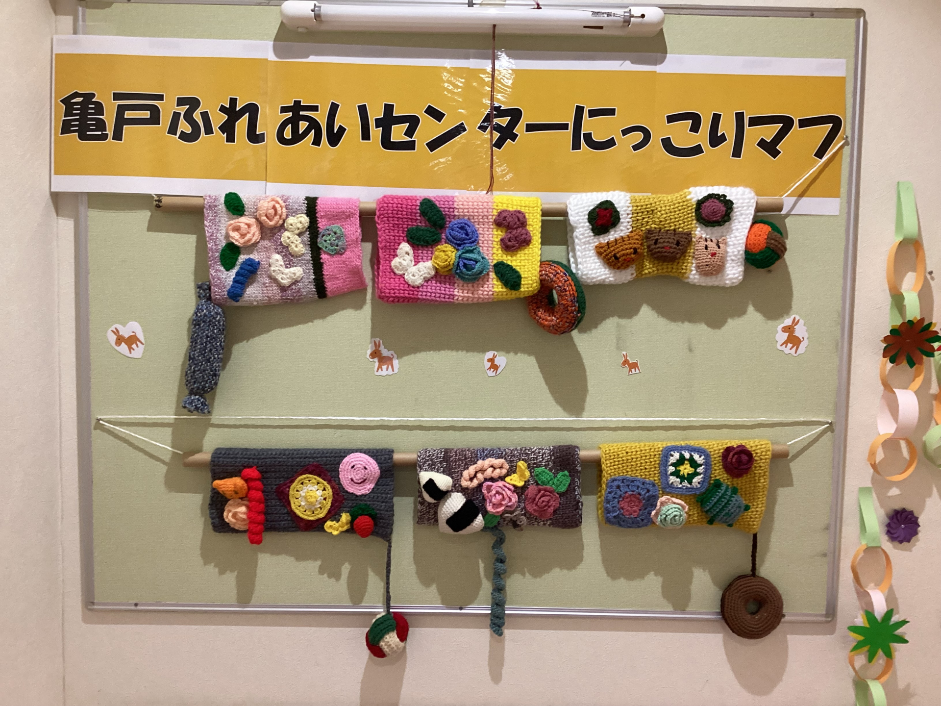 にっこりマフは認知症の方が心穏やかになれるものとして活用されているもので、展示してあるものは利用者さんの手作りになります。