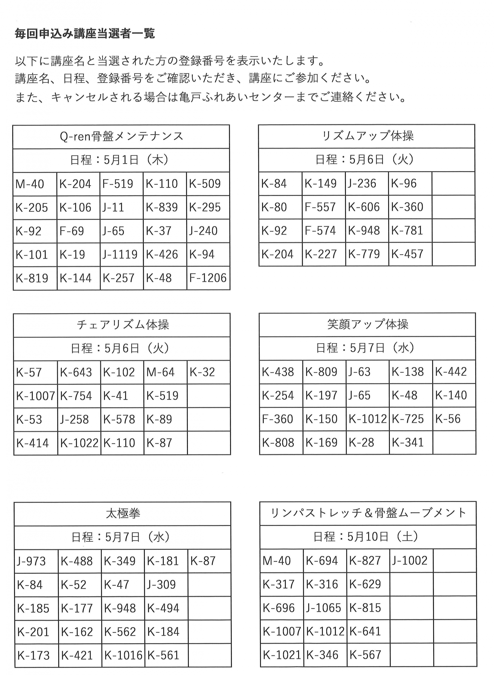 5月前半開催の毎回申込み講座の当選発表をいたします。