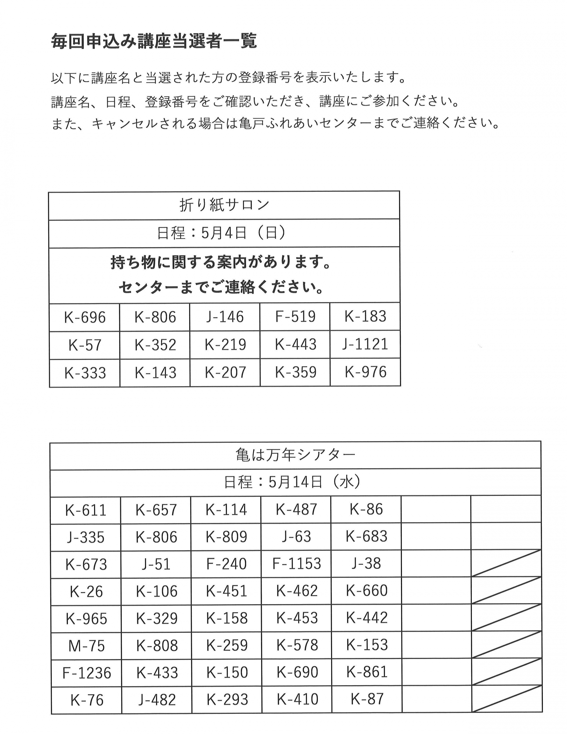 5月前半開催の毎回申込み講座の当選発表をいたします。