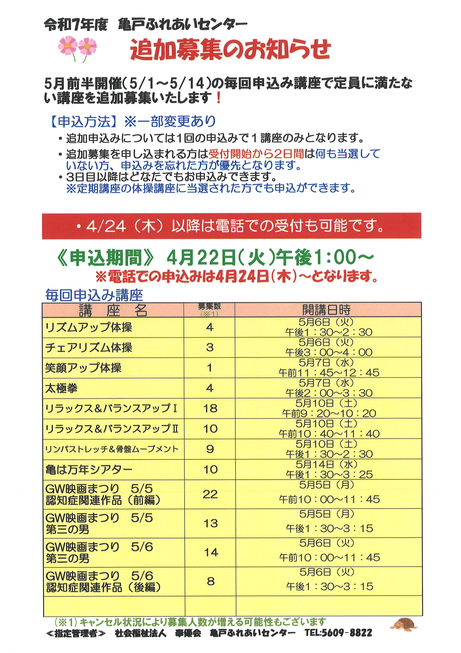 5月前半開催の毎回申込講座で定員に満たなかった講座の追加募集を行います。追加募集する講座は以下の講座となります。