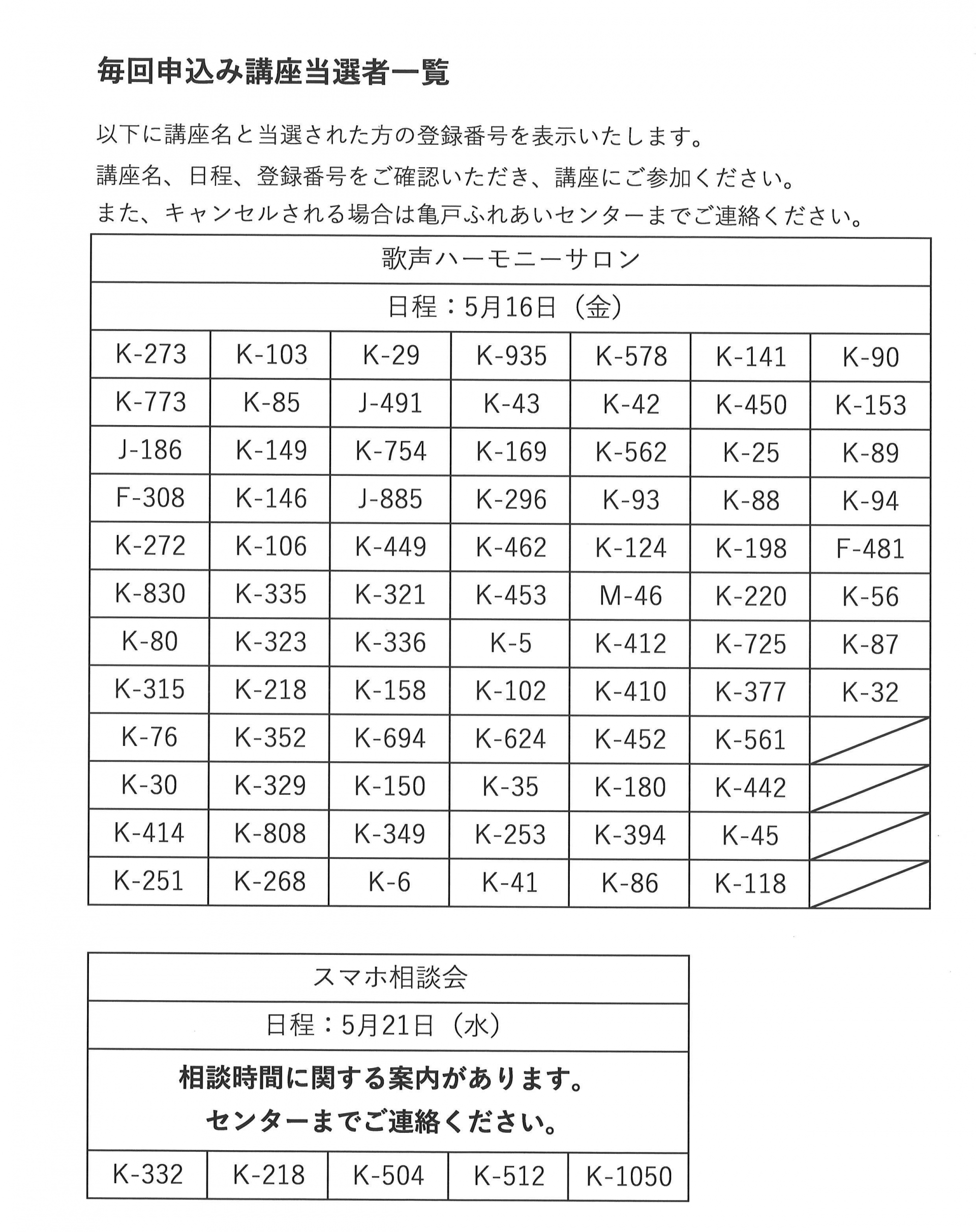5月後半開催の毎回申込み講座の当選発表をいたします。