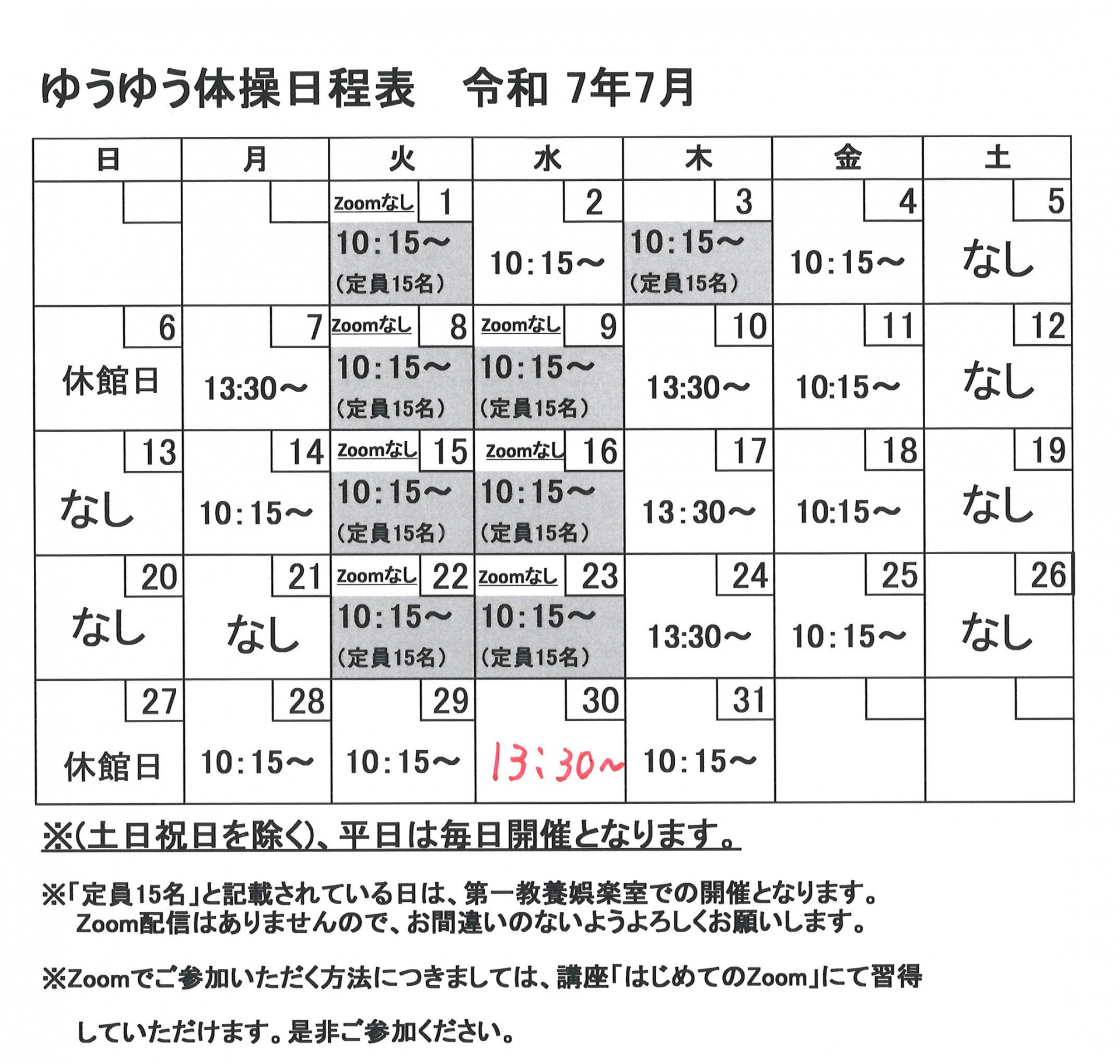 7月開催【ゆうゆう体操、カラオケ自由開放、卓球自由開放】日程表のお知らせです。