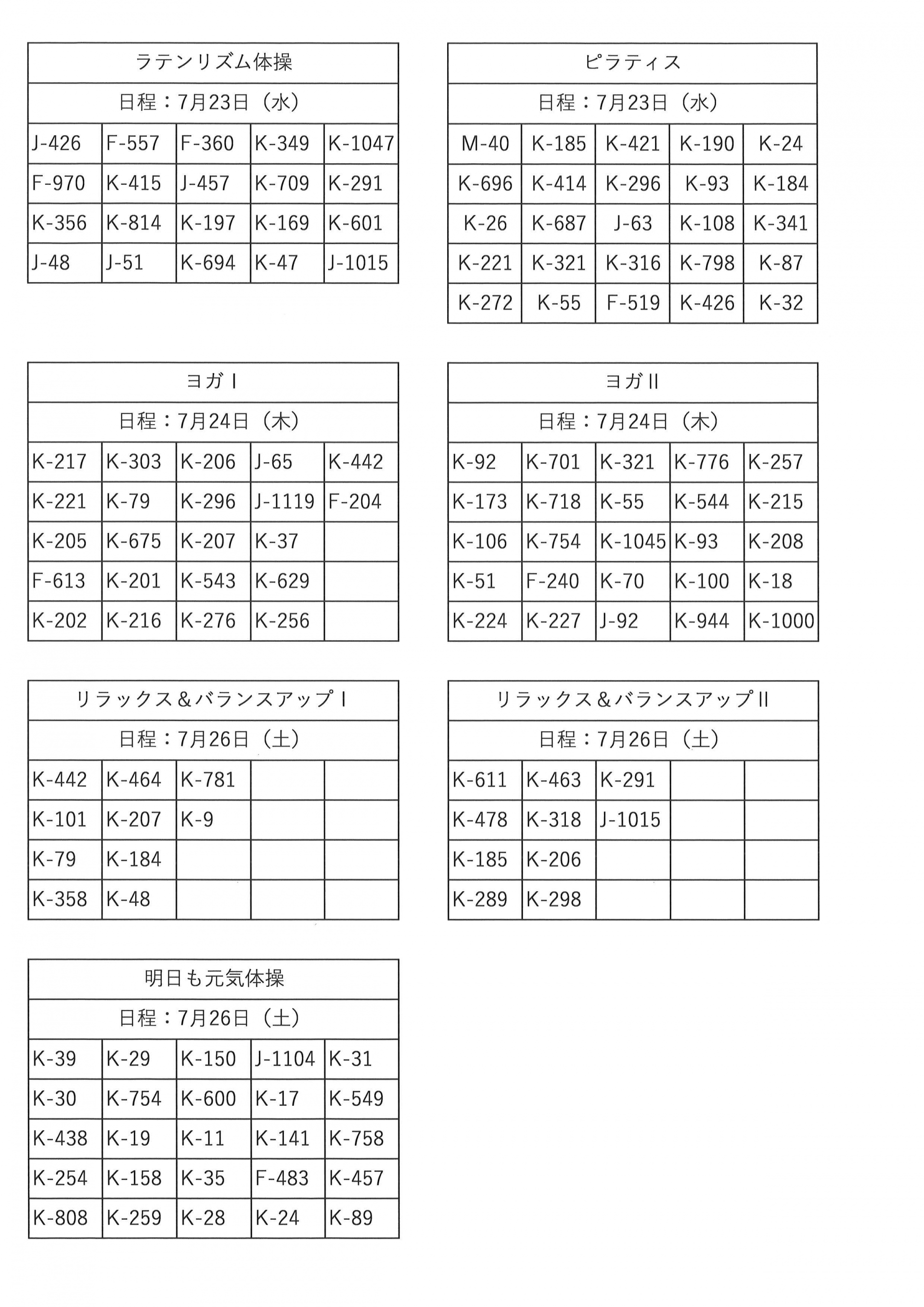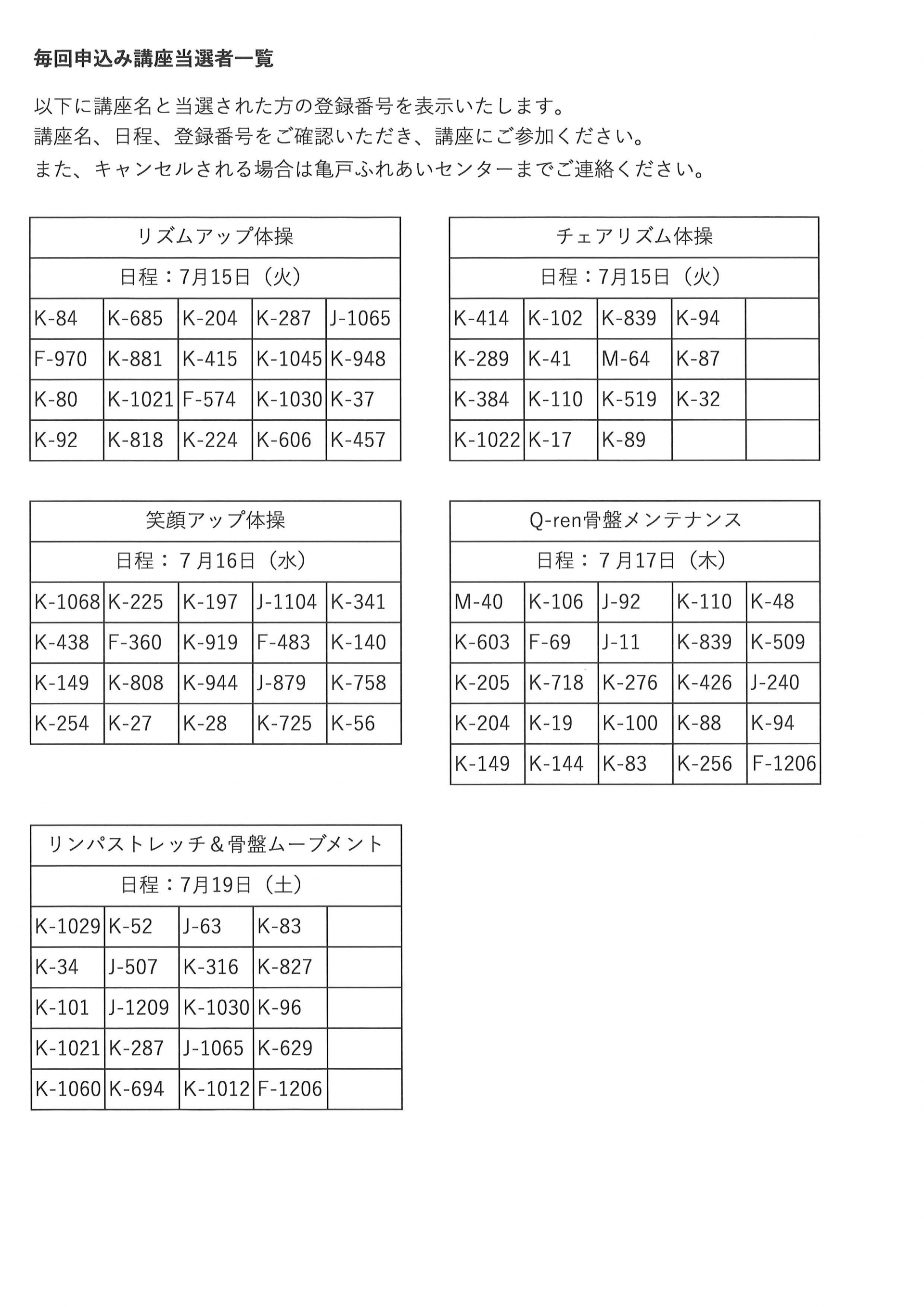 7月後半毎回申込講座 当選者連絡その1【体操講座】