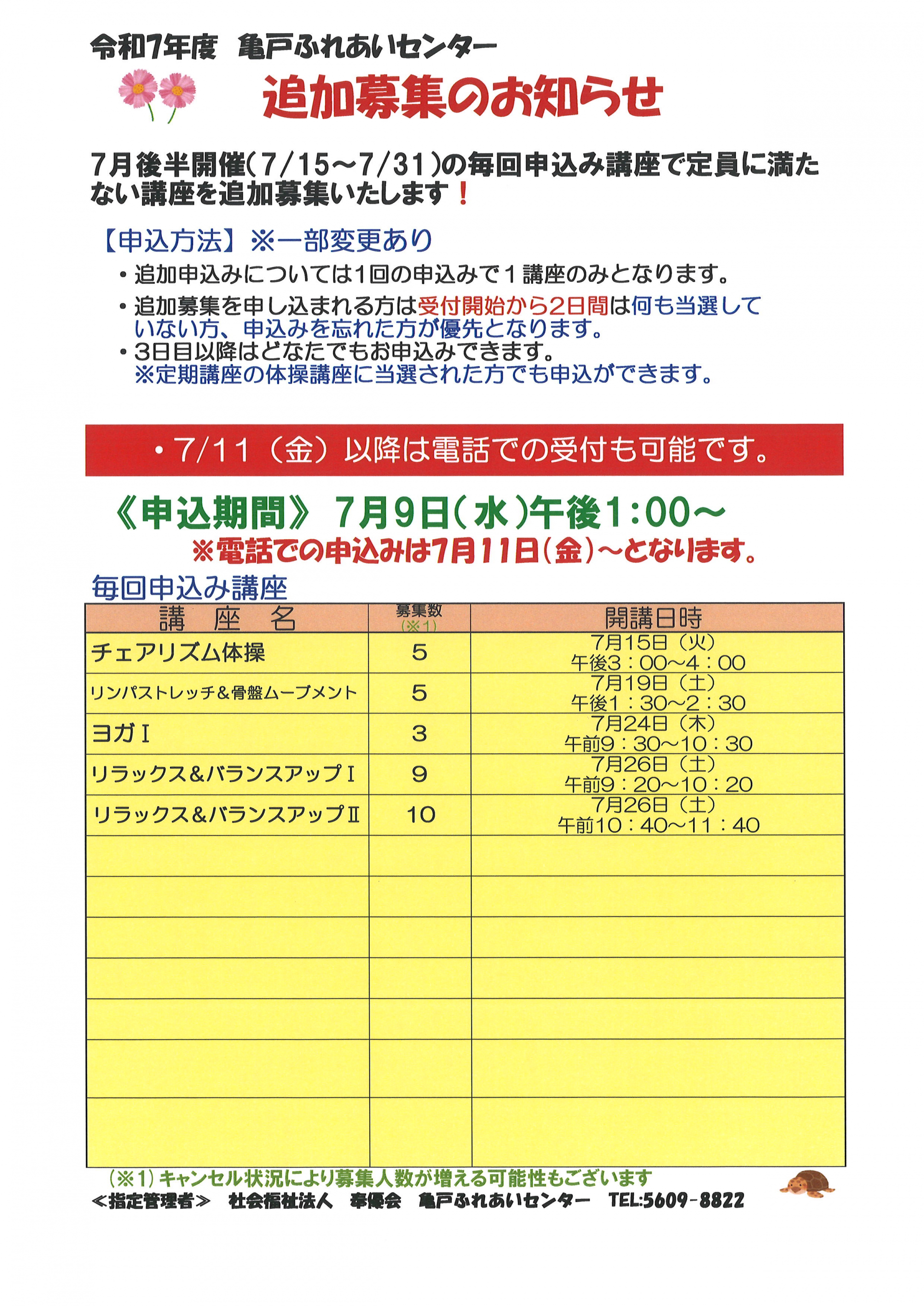 7月後半開催の毎回申込講座で定員に満たなかった講座の追加募集を行います。追加募集する講座は以下の講座となります。