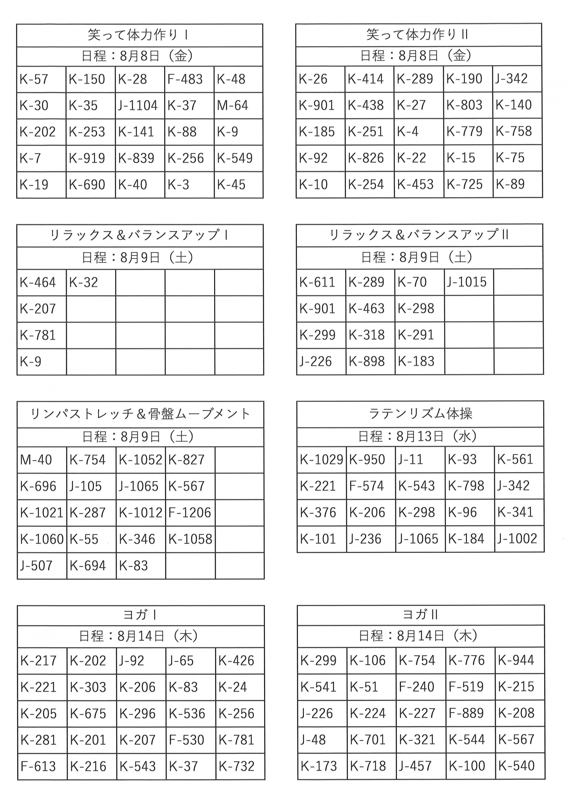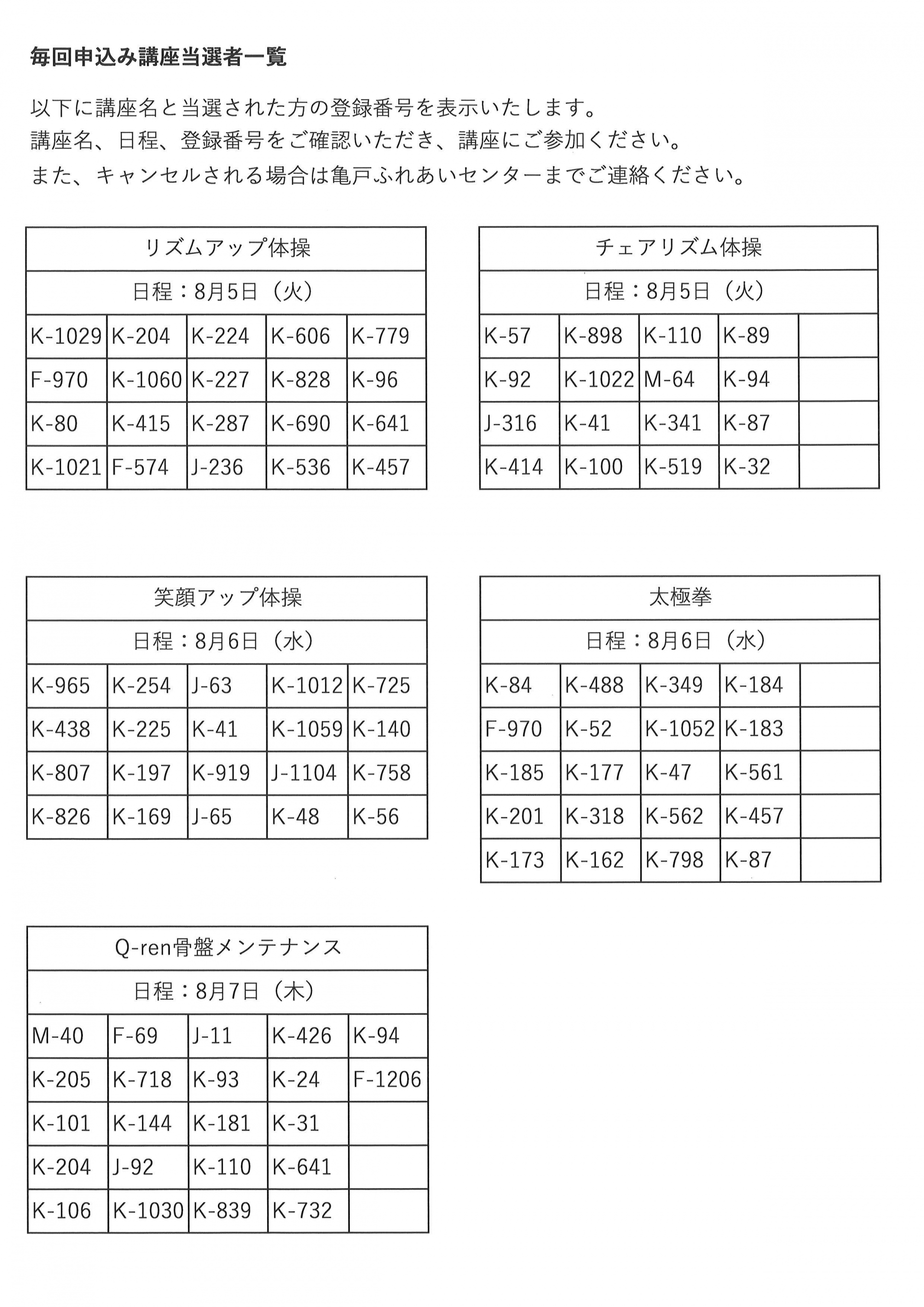 8月前半毎回申込講座 当選者連絡その1【体操講座】