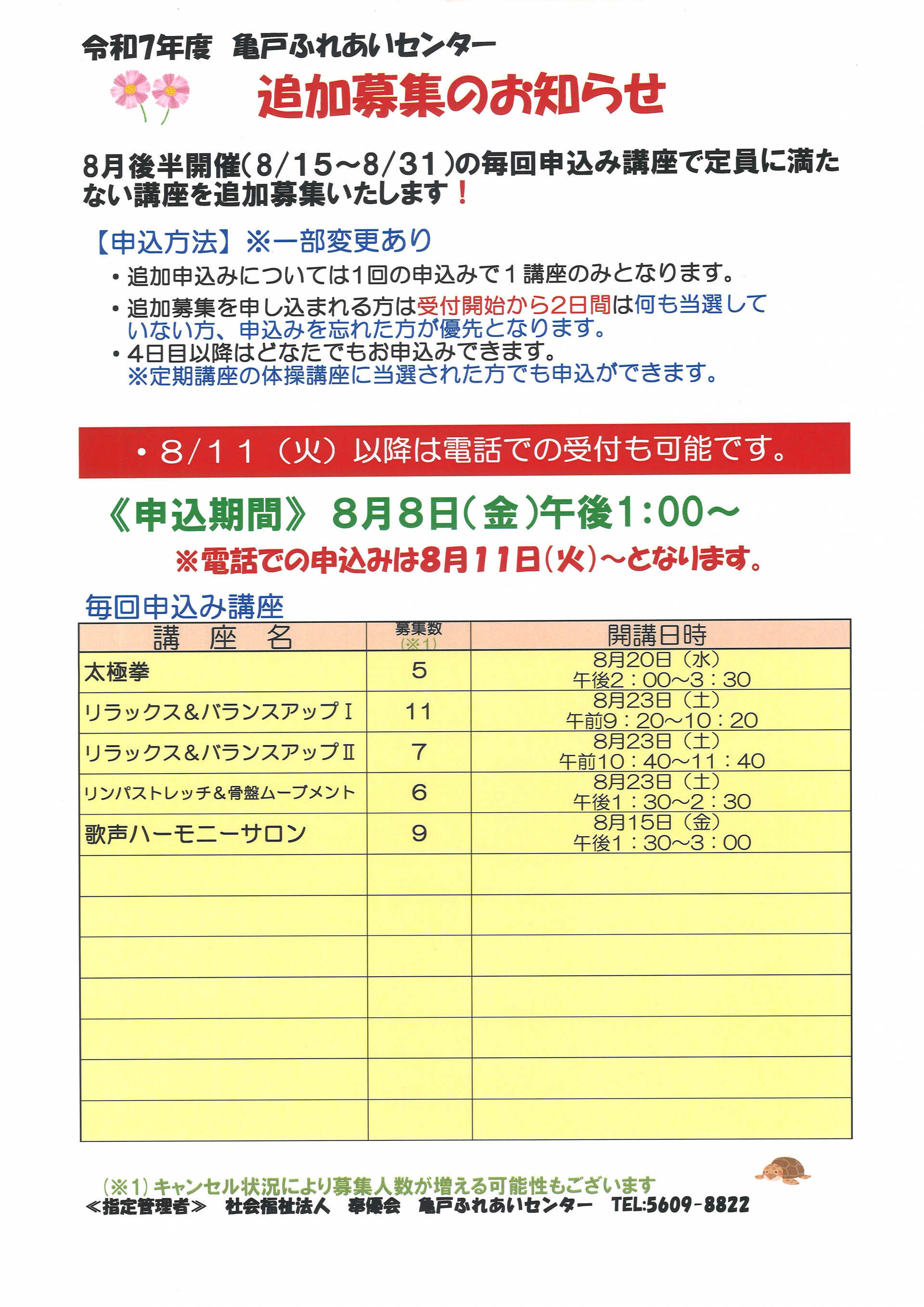 8月後半開催の毎回申込講座で定員に満たなかった講座の追加募集を行います。追加募集する講座は以下の講座となります。