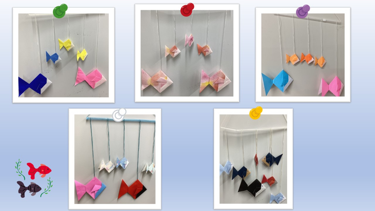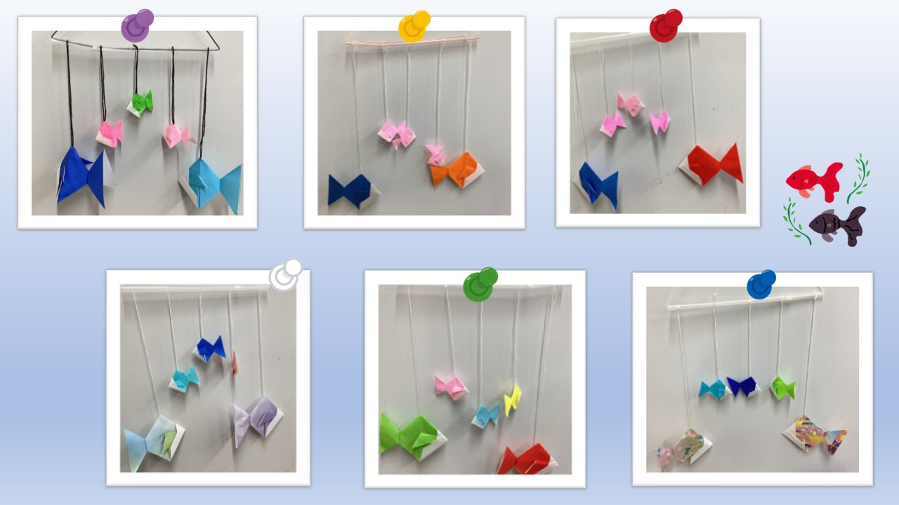 しかし、ただ折るだけでは終わりません。ストローと紐を使って吊るし、風に揺れるかわいい金魚を作りました!