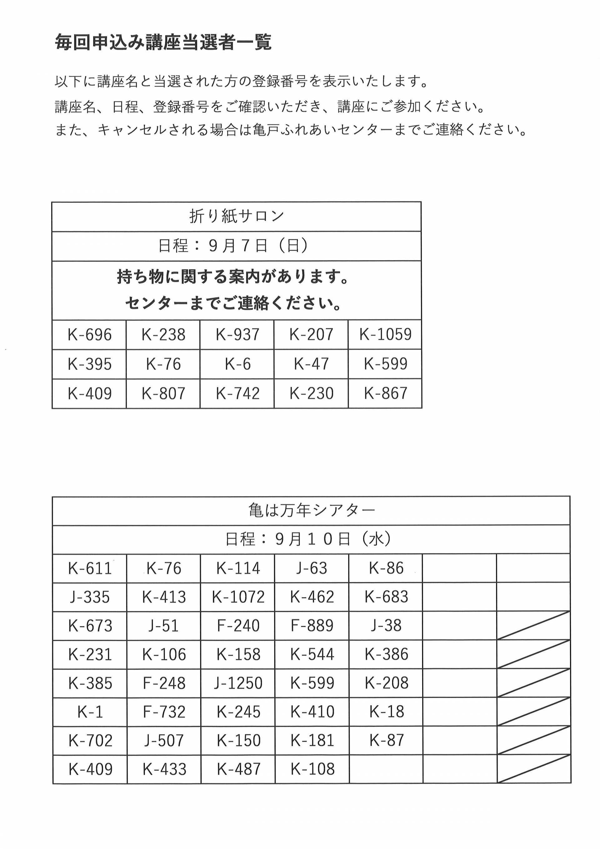 9月前半開催の毎回申込み講座の当選発表をいたします。