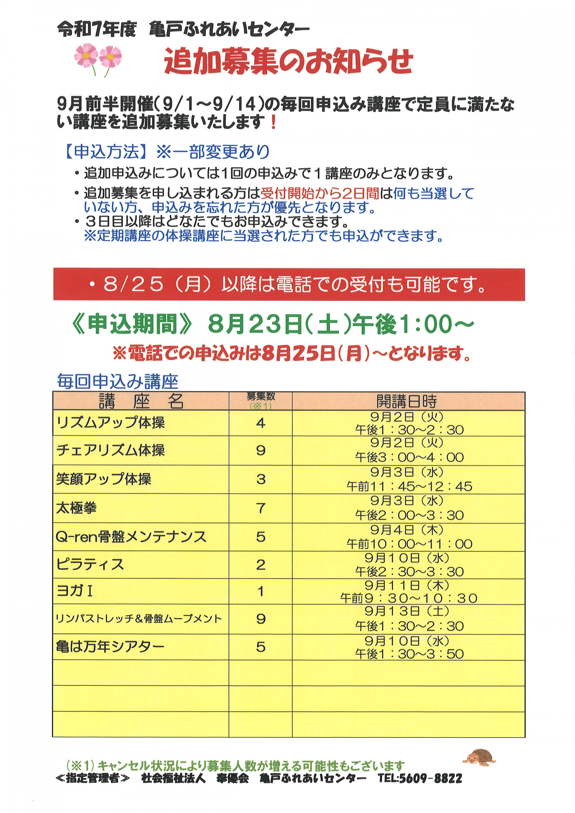 9月前半開催の毎回申込講座で定員に満たなかった講座の追加募集を行います。追加募集する講座は以下の講座となります。