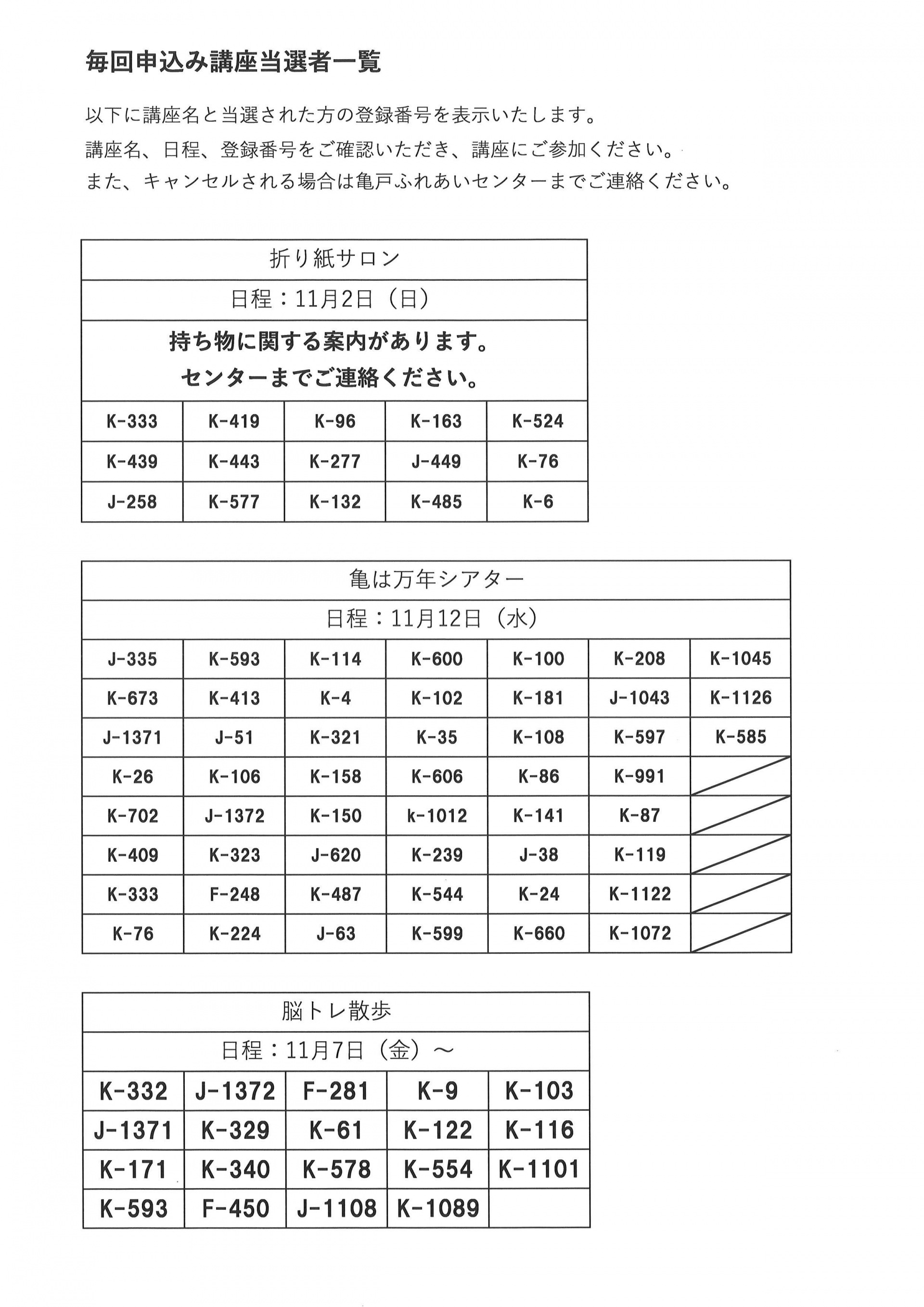 11月前半毎回申込講座 当選連絡その2【その他の講座】
