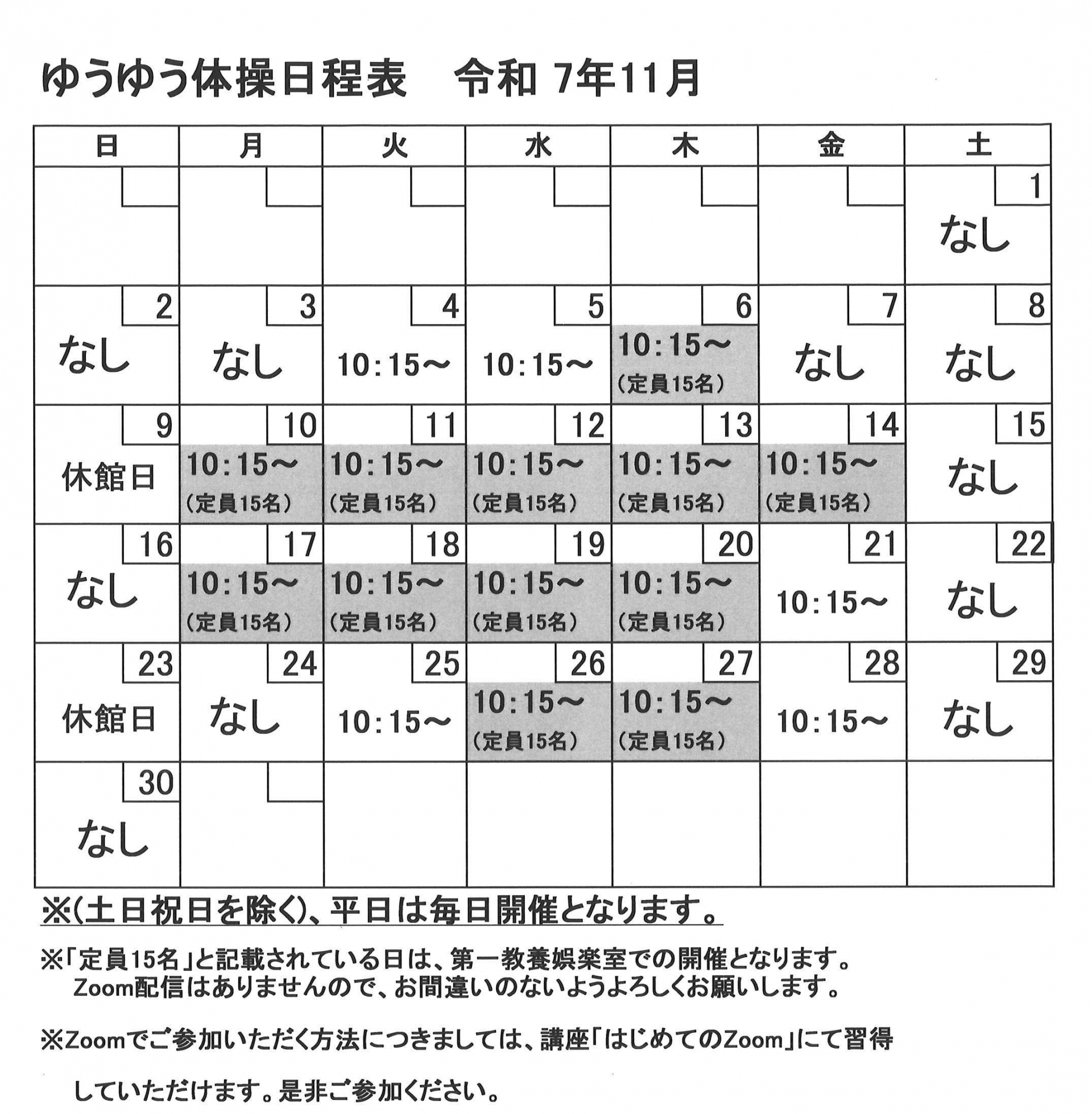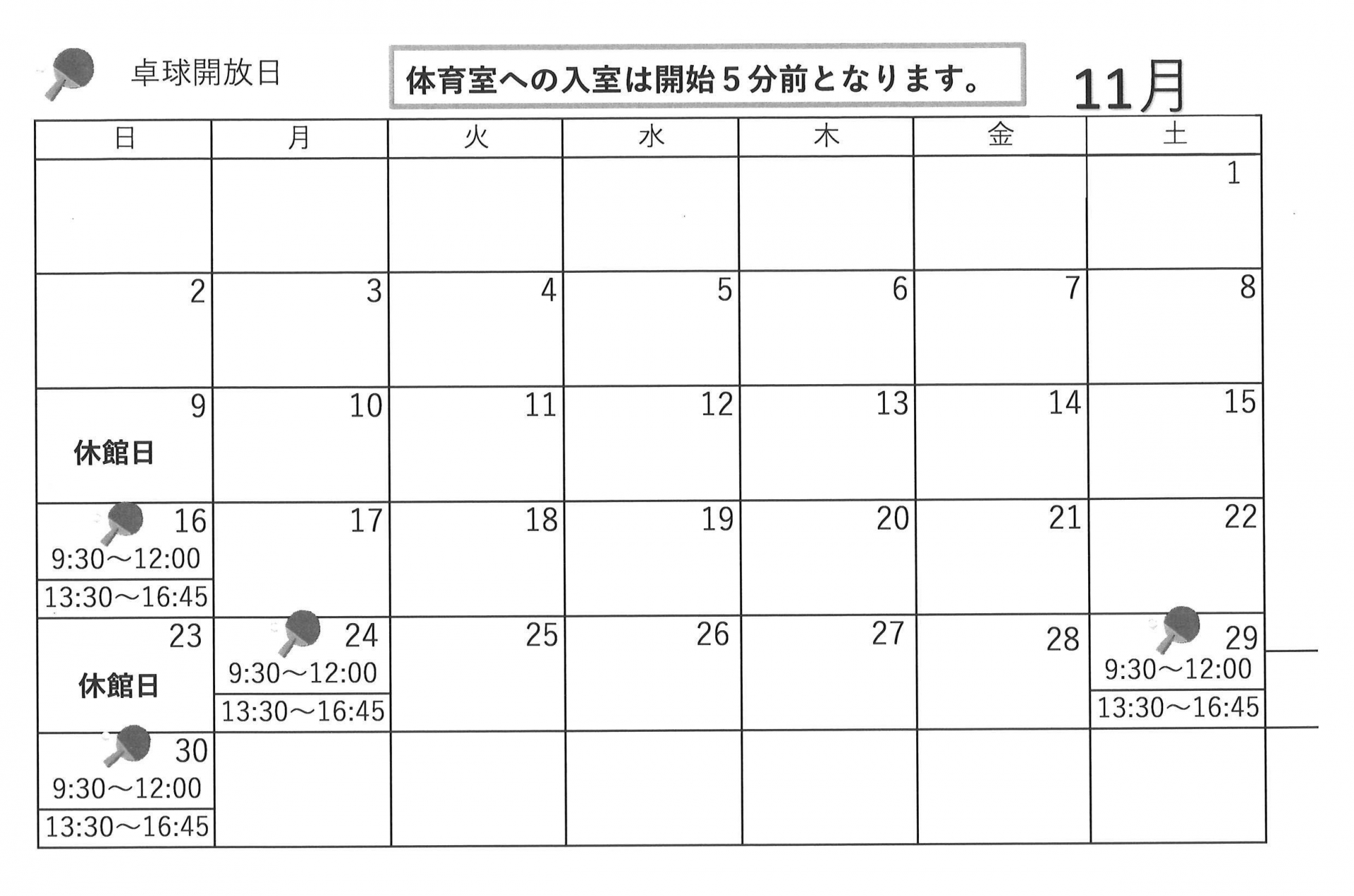 11月開催【ゆうゆう体操、カラオケ自由開放、卓球自由開放】日程表のお知らせです。