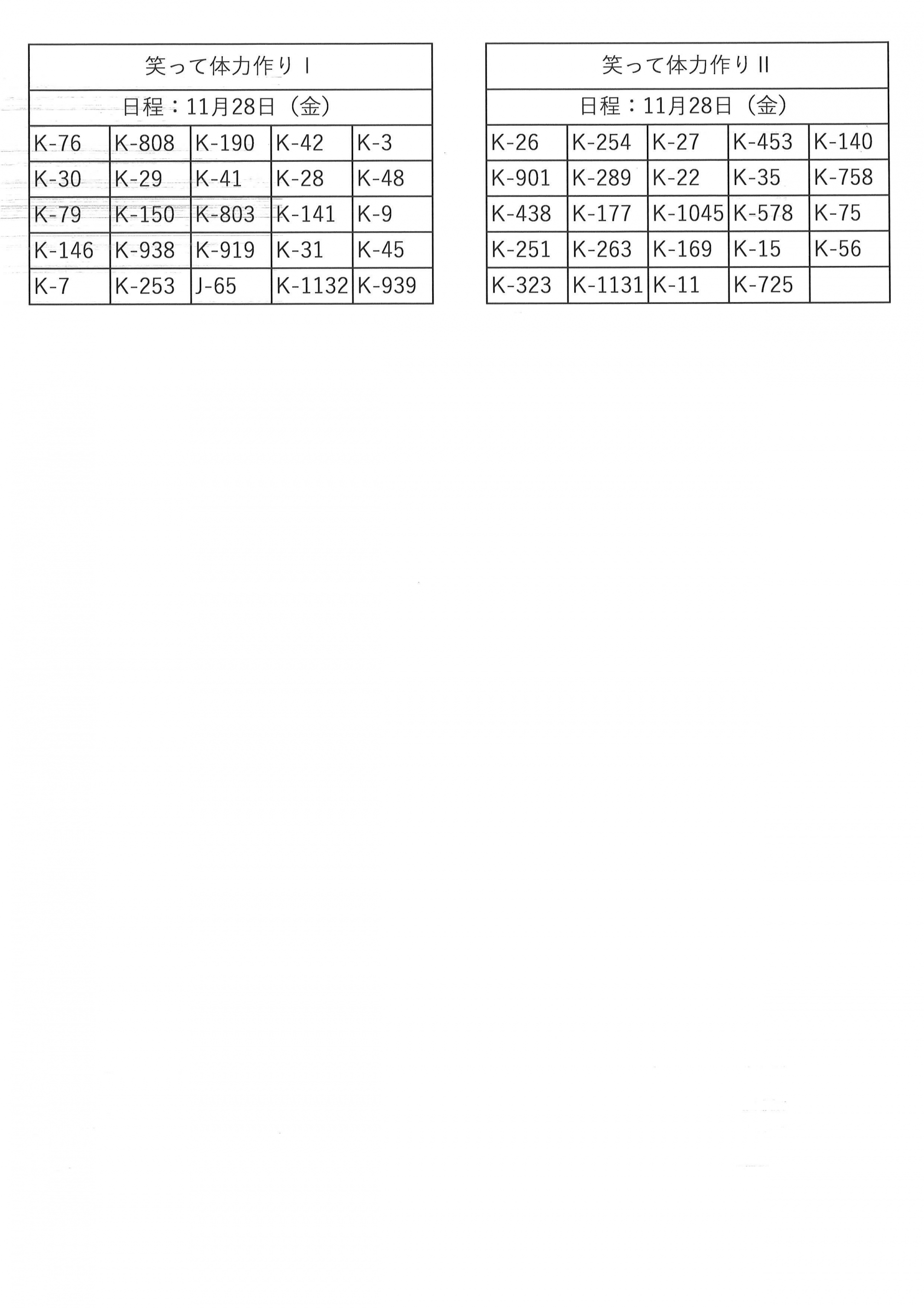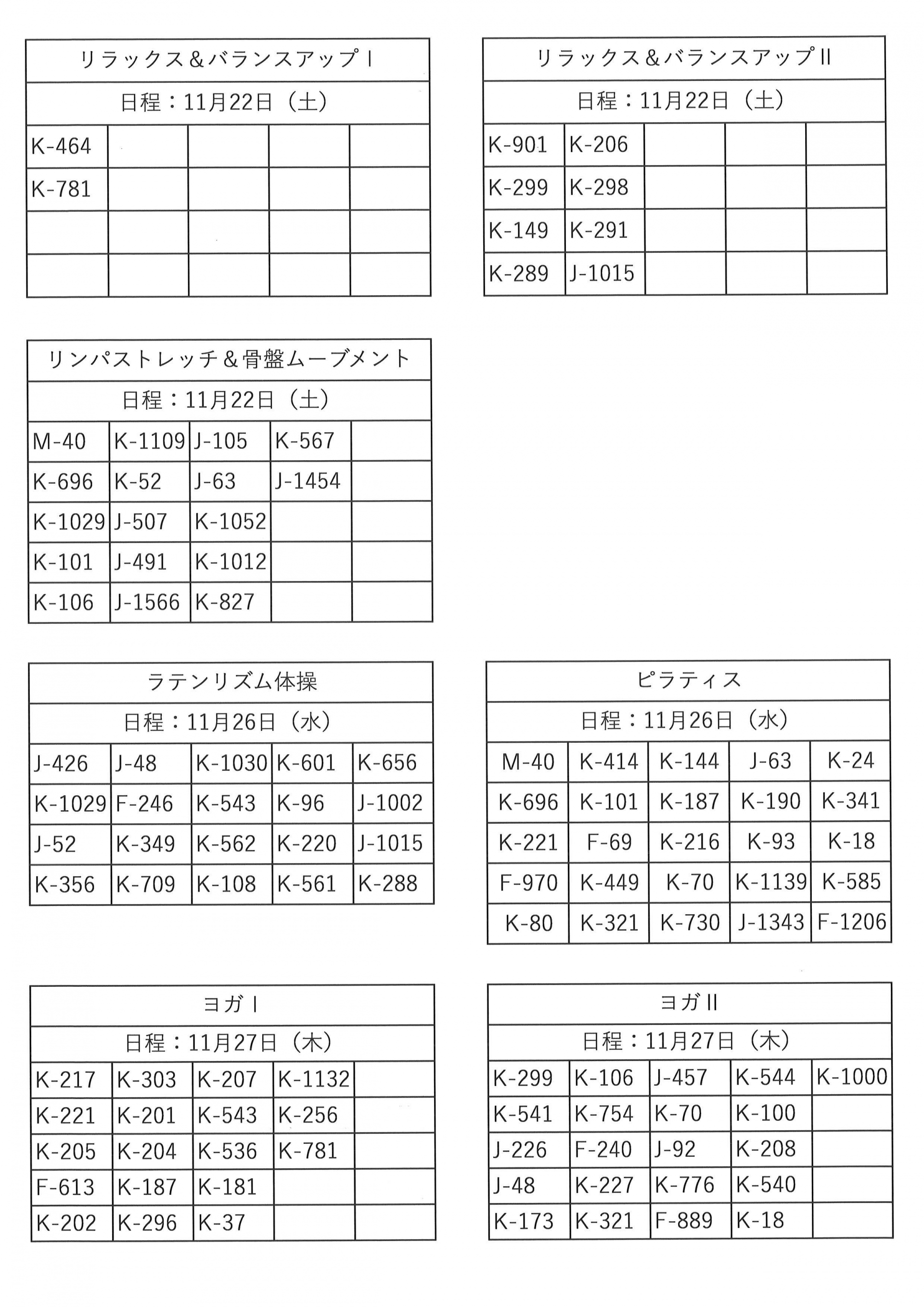 その1では、きらめき体操、リズムアップ体操、チェアリズム体操、笑顔アップ体操、太極拳、Q-ren骨盤メンテナンス、ラテンリズム体操、ピラティス、ヨガⅠ・Ⅱ、笑って体力作りⅠ・Ⅱ、リラックス&バランスアップⅠ・Ⅱ、リンパストレッチ&骨盤ムーブメント、の結果を発表いたします。