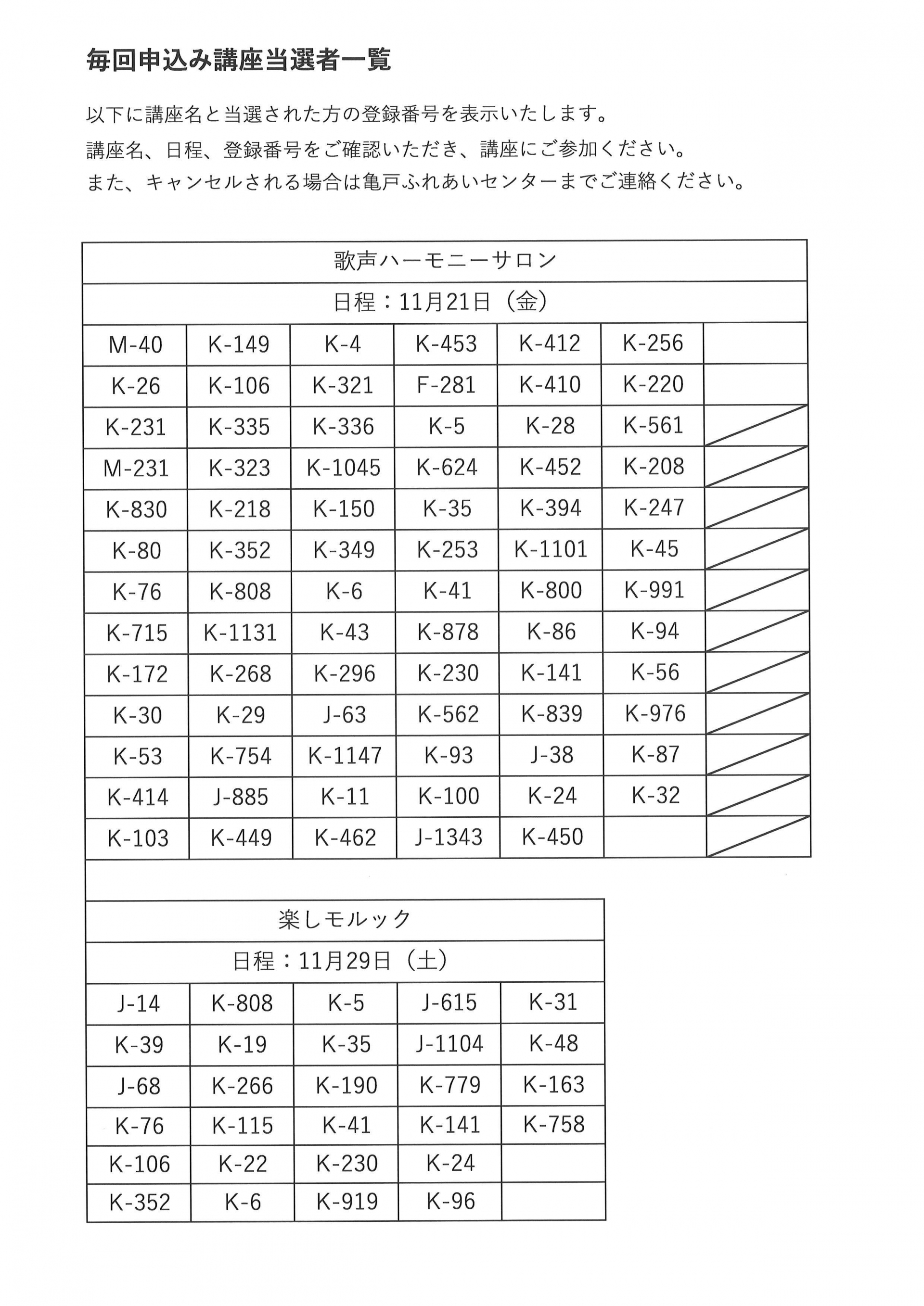 11月後半開催の毎回申込み講座の当選発表をいたします。