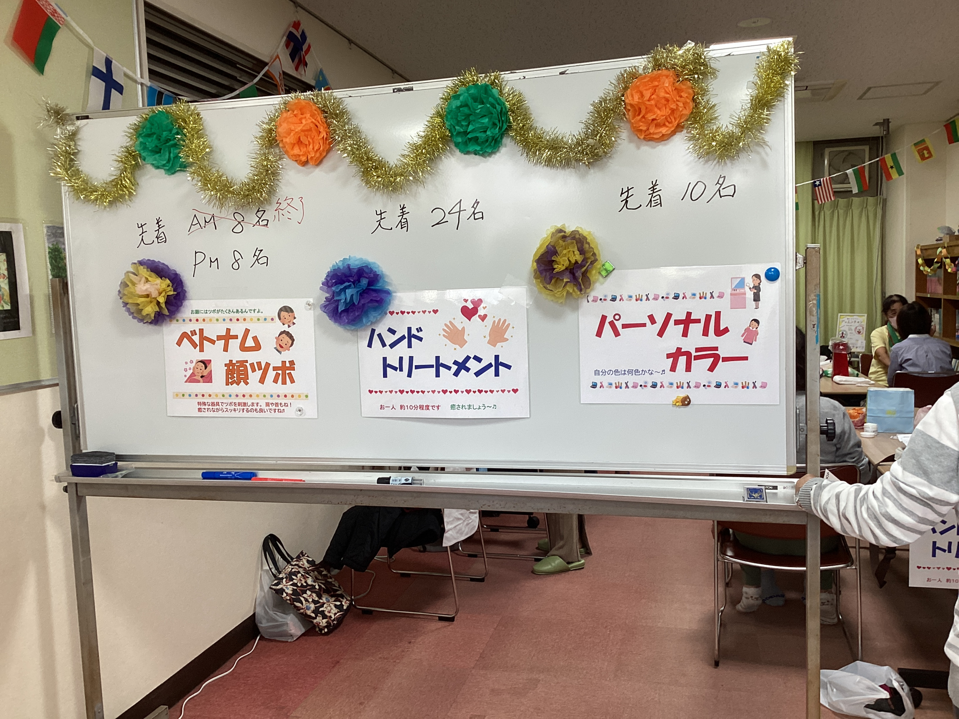 令和7年11月8日(土)午前10時から恒例のにこにこ秋まつりを開催しました。今回は~癒しのコーナー~のようすをご紹介します。ハンドトリートメント当日先着20名、パーソナルカラー当日先着10名、ベトナム顔ツボ当日先着午前・午後各8名の方々に体験していただきました。