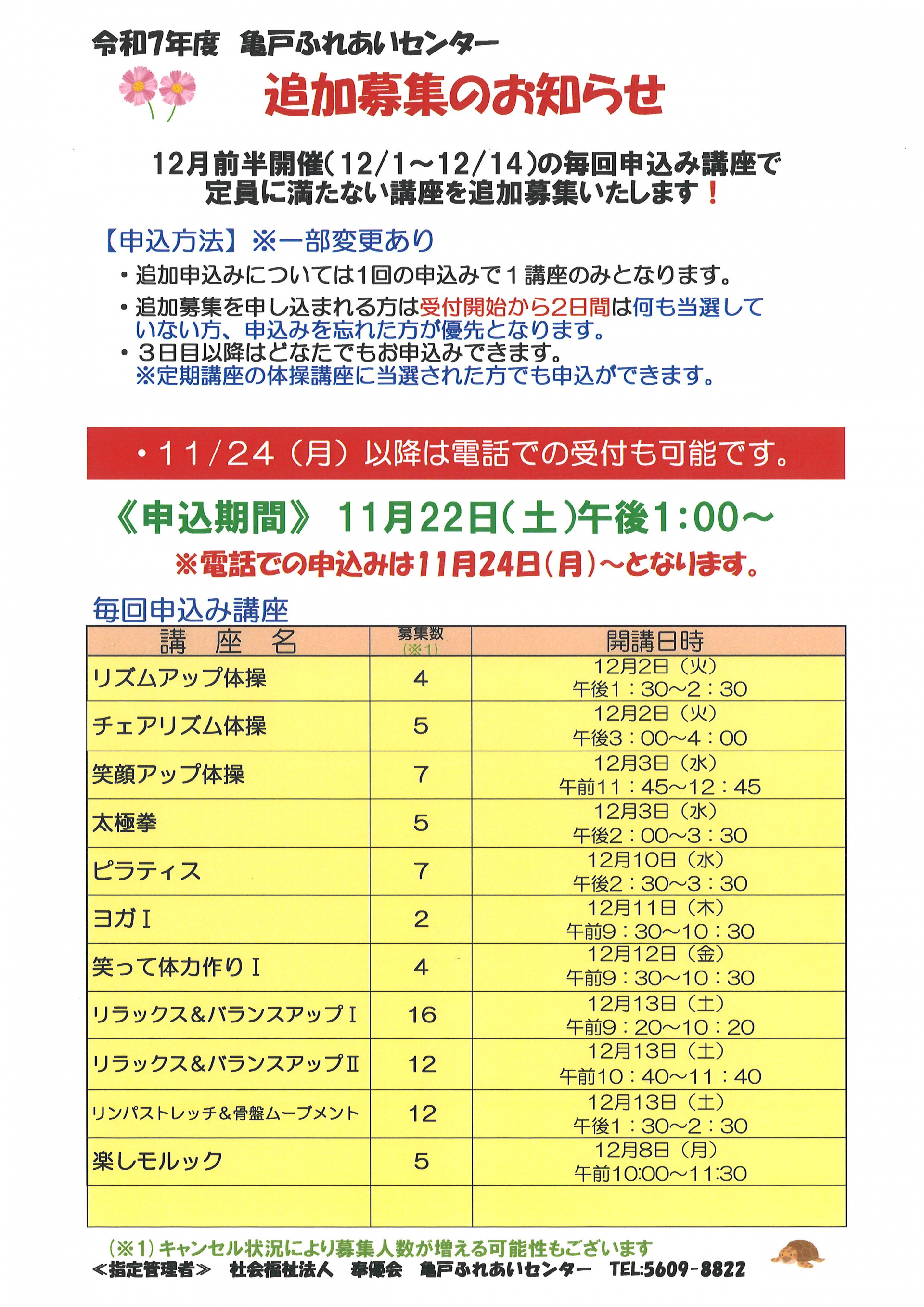 12月前半開催の毎回申込講座で定員に満たなかった講座の追加募集を行います。追加募集する講座は以下の講座となります。