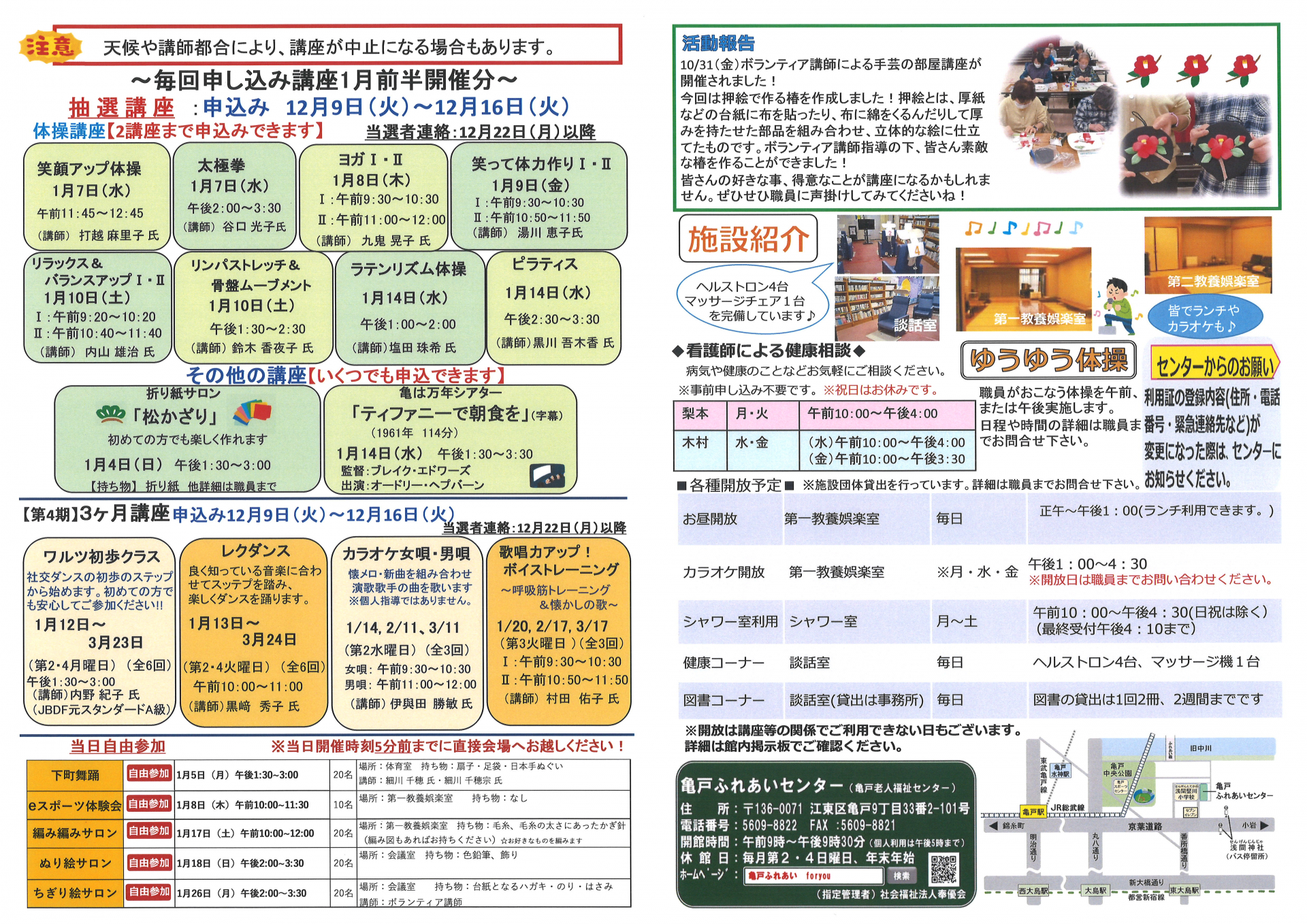 2025.11.25 お知らせ 2025年亀戸ふれあいセンター12月号おたより Tweet シェアする 2025年亀戸ふれあいセンター12月号おたより完成しました。 亀戸ふれあいセンター F.A 前の記事 2025.11.25 お知らせ 2025年亀戸ふれあいセンター12月号予定表 次の記事 2025.11.24 お知らせ 祝!ドリかめスタンプ 700個達成!! 一覧へ戻る