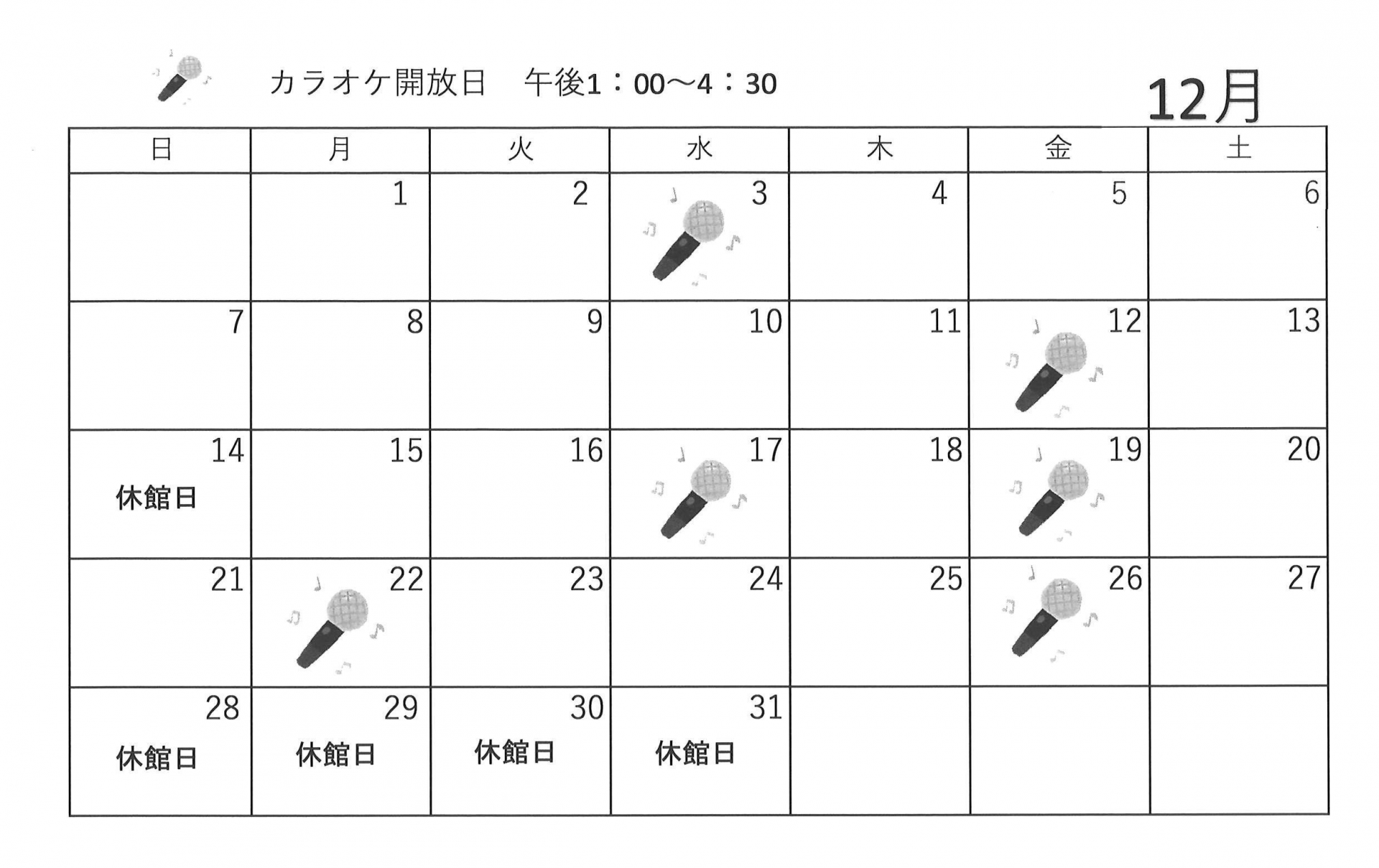 12月自由参加日程表【ゆうゆう体操、カラオケ自由開放、卓球自由開放】