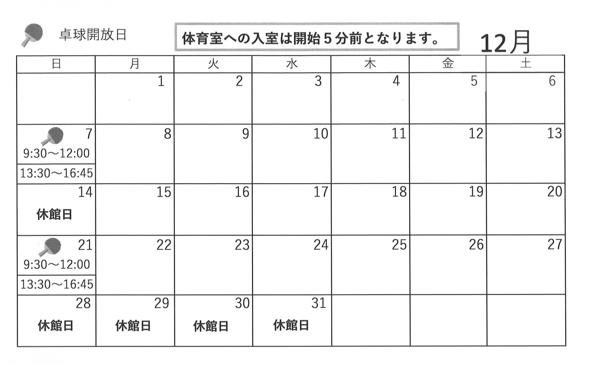 12月開催【ゆうゆう体操、カラオケ自由開放、卓球自由開放】日程表のお知らせです。
