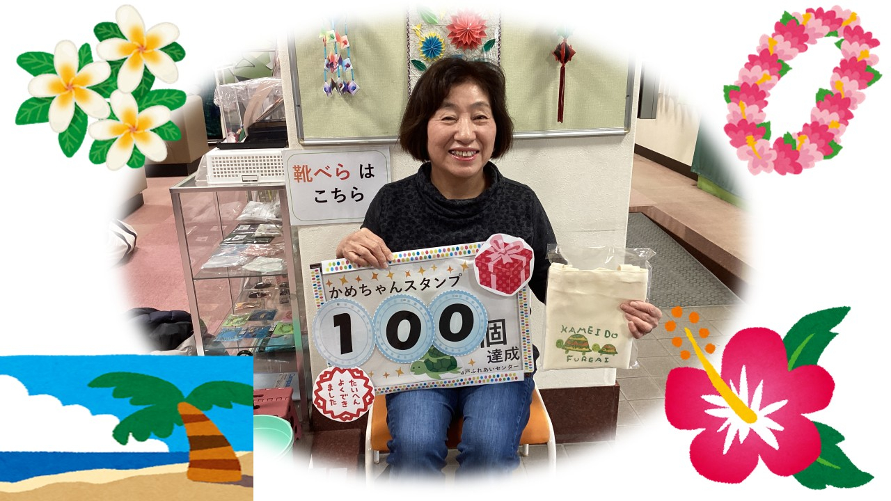 亀戸ふれあいセンター来館時のお楽しみ、一日1つ押させていただくかめちゃんスタンプを100個達成しました、M.K様です。