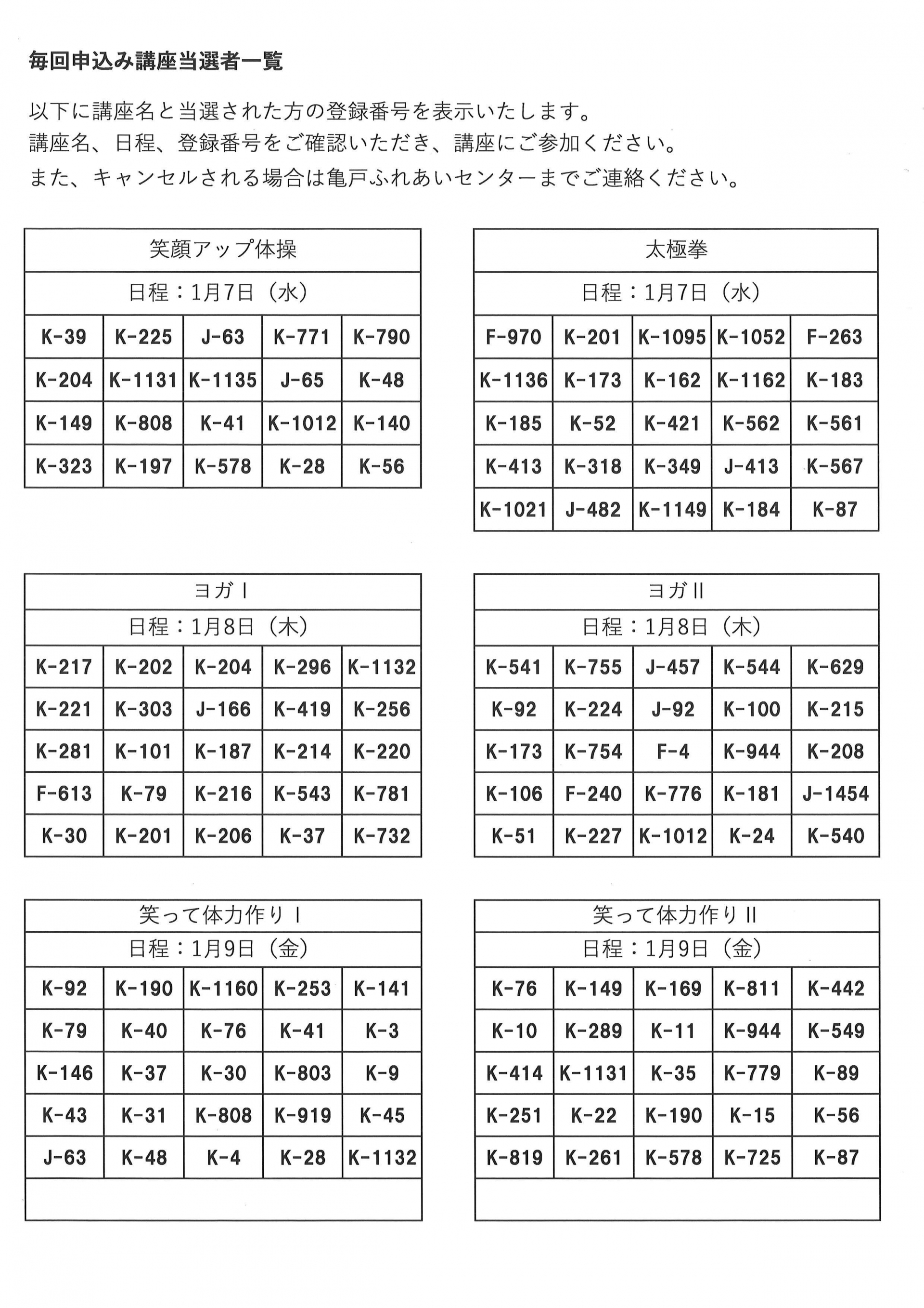 1月前半開催の毎回申込み講座の当選発表