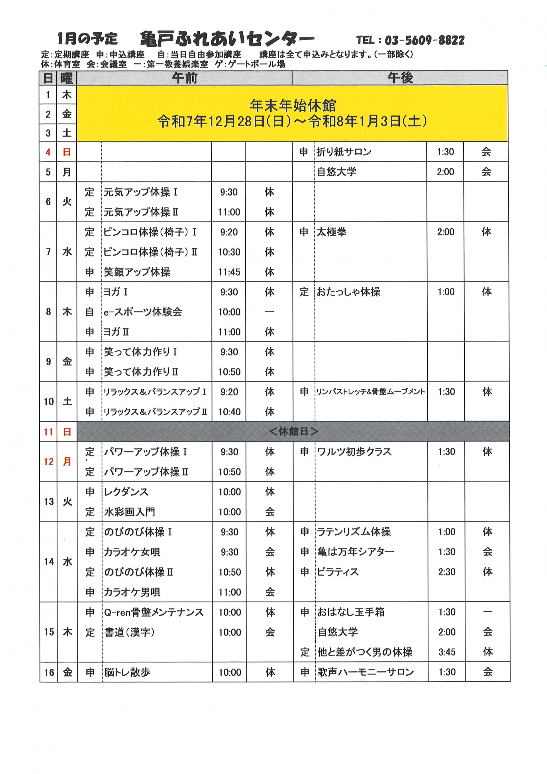 2025.12.23 お知らせ 2026年亀戸ふれあいセンター1月号予定表 Tweet シェアする 2026年亀戸ふれあいセンター1月号予定表が完成しました。 亀戸ふれあいセンター F.A 前の記事 2025.12.23 お知らせ 1月自由参加日程表【ゆうゆう体操、カラオケ自由開放、卓球自由開放】 次の記事 2025.12.23 お知らせ 2026年亀戸ふれあいセンター1月号おたより 一覧へ戻る
