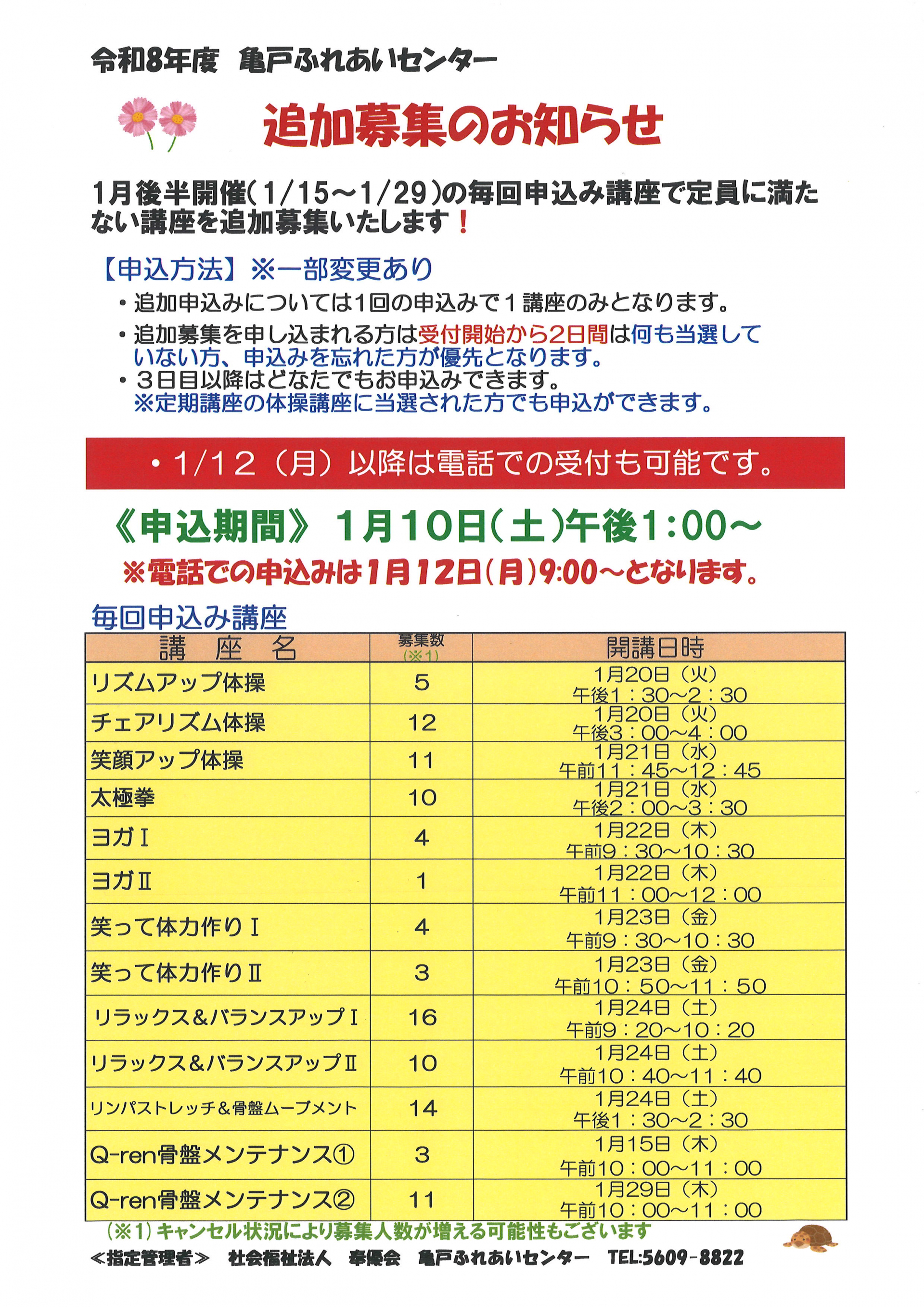 1月後半開催の毎回申込講座で定員に満たなかった講座の追加募集を行います。追加募集する講座は以下の講座となります。