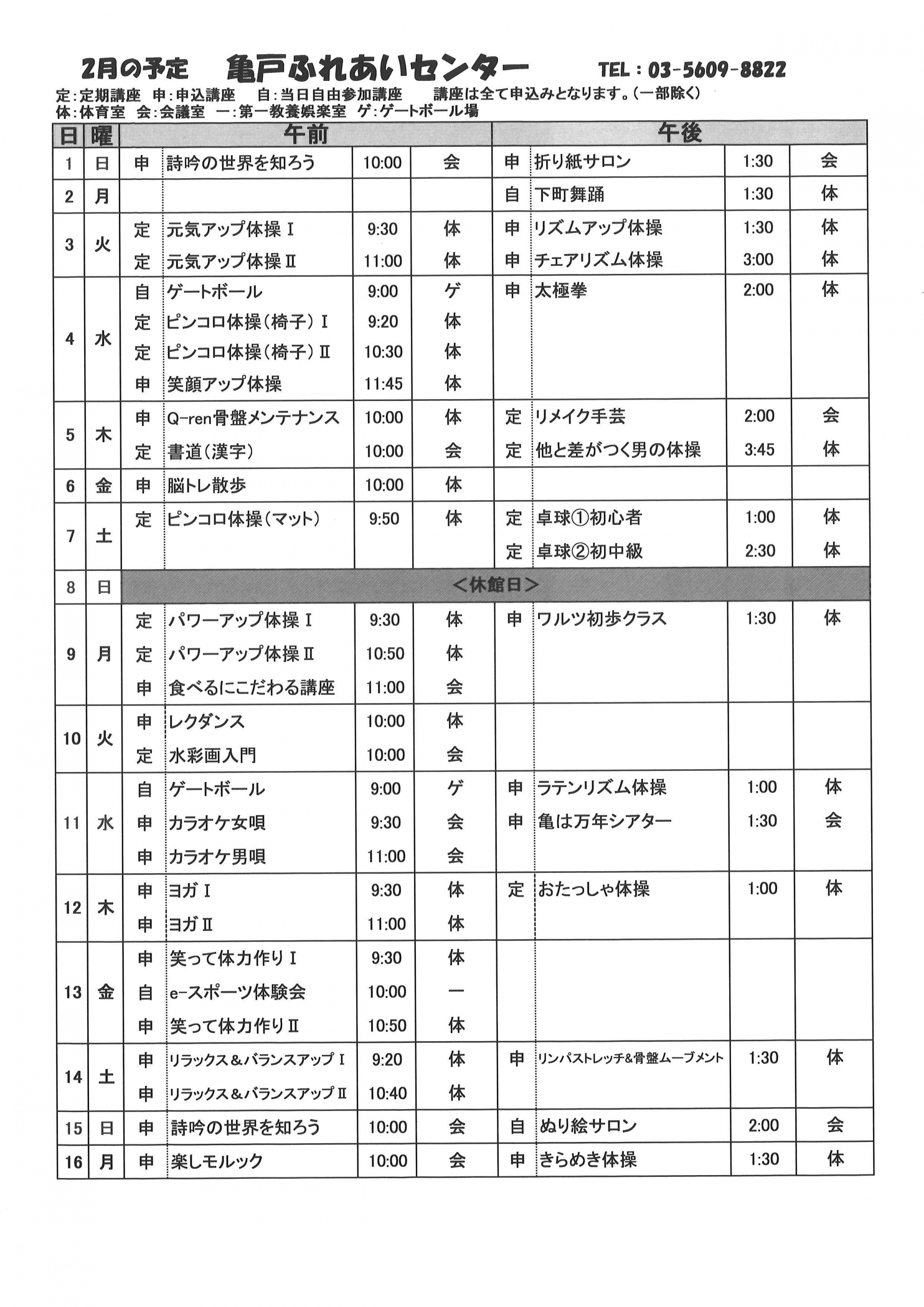 2026.01.24 お知らせ 2026年亀戸ふれあいセンター2月号予定表 Tweet シェアする 2026年亀戸ふれあいセンター2月号予定表が完成しました。 亀戸ふれあいセンター F.A 前の記事 2026.01.25 お知らせ 募集開始しました♬ 『チョコレートの世界へようこそ』 を開催しま~す 次の記事 2026.01.24 お知らせ 2026年亀戸ふれあいセンター2月号おたより 一覧へ戻る