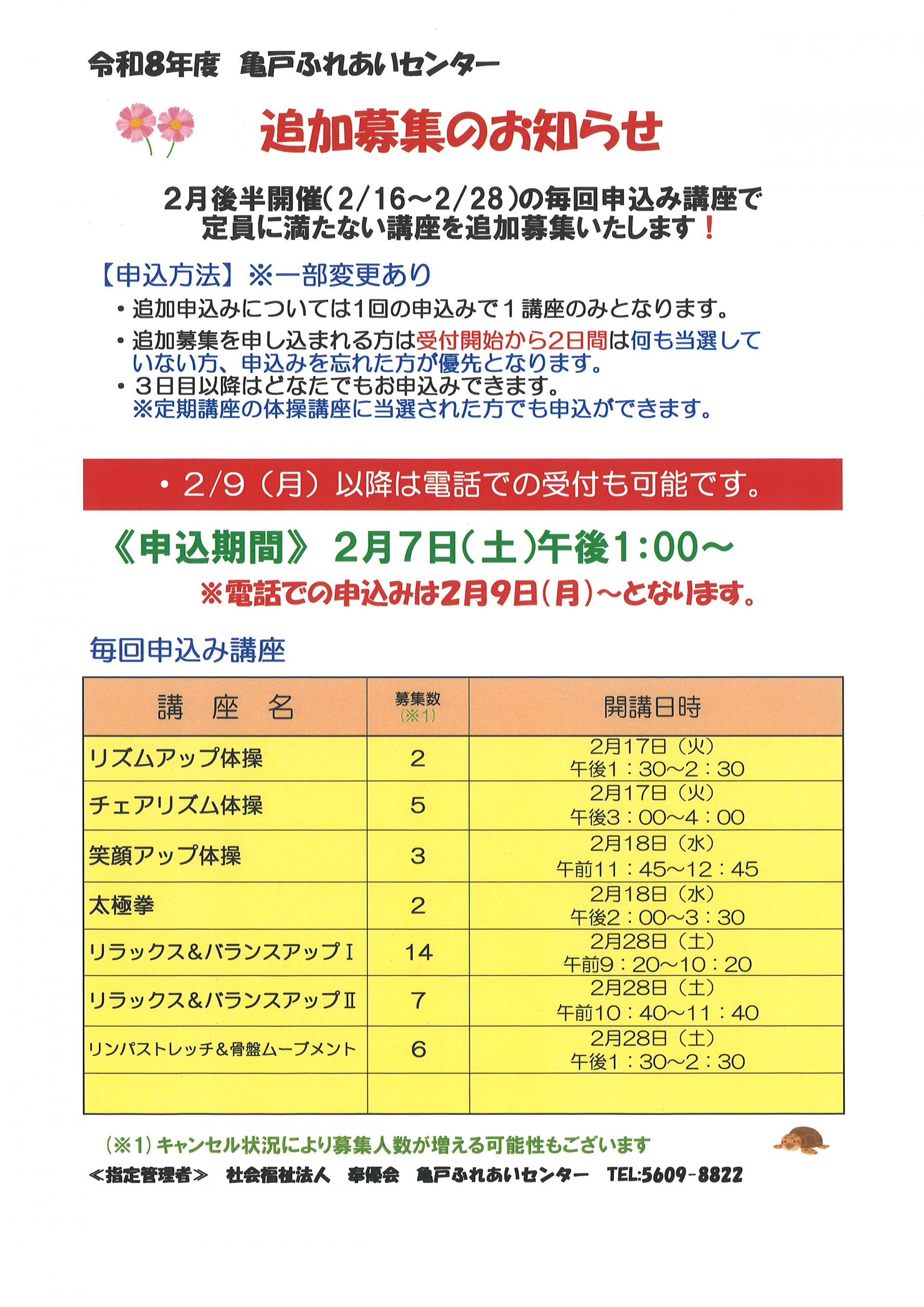 2月後半開催の毎回申込講座で定員に満たなかった講座の追加募集を行います。追加募集する講座は以下の講座となります。