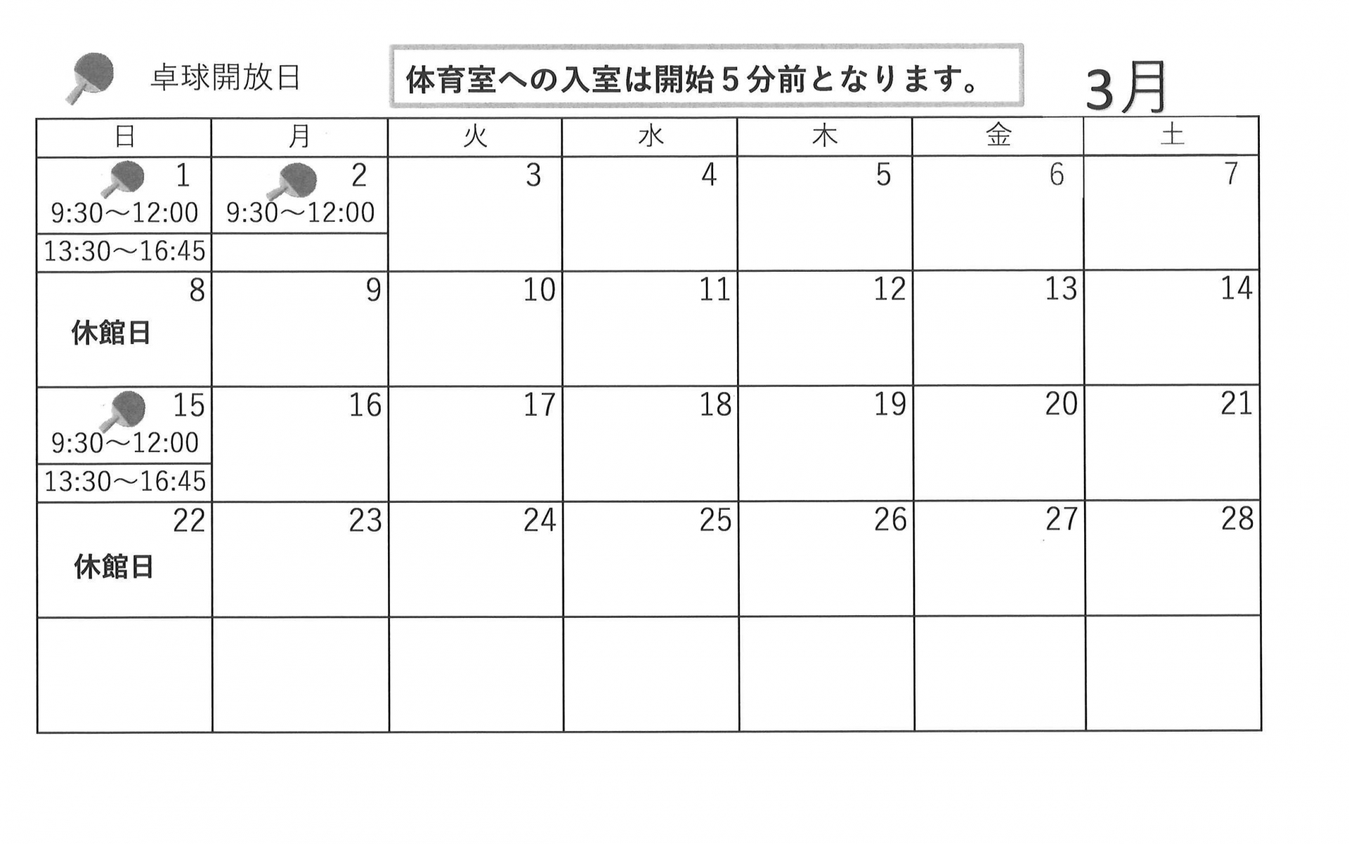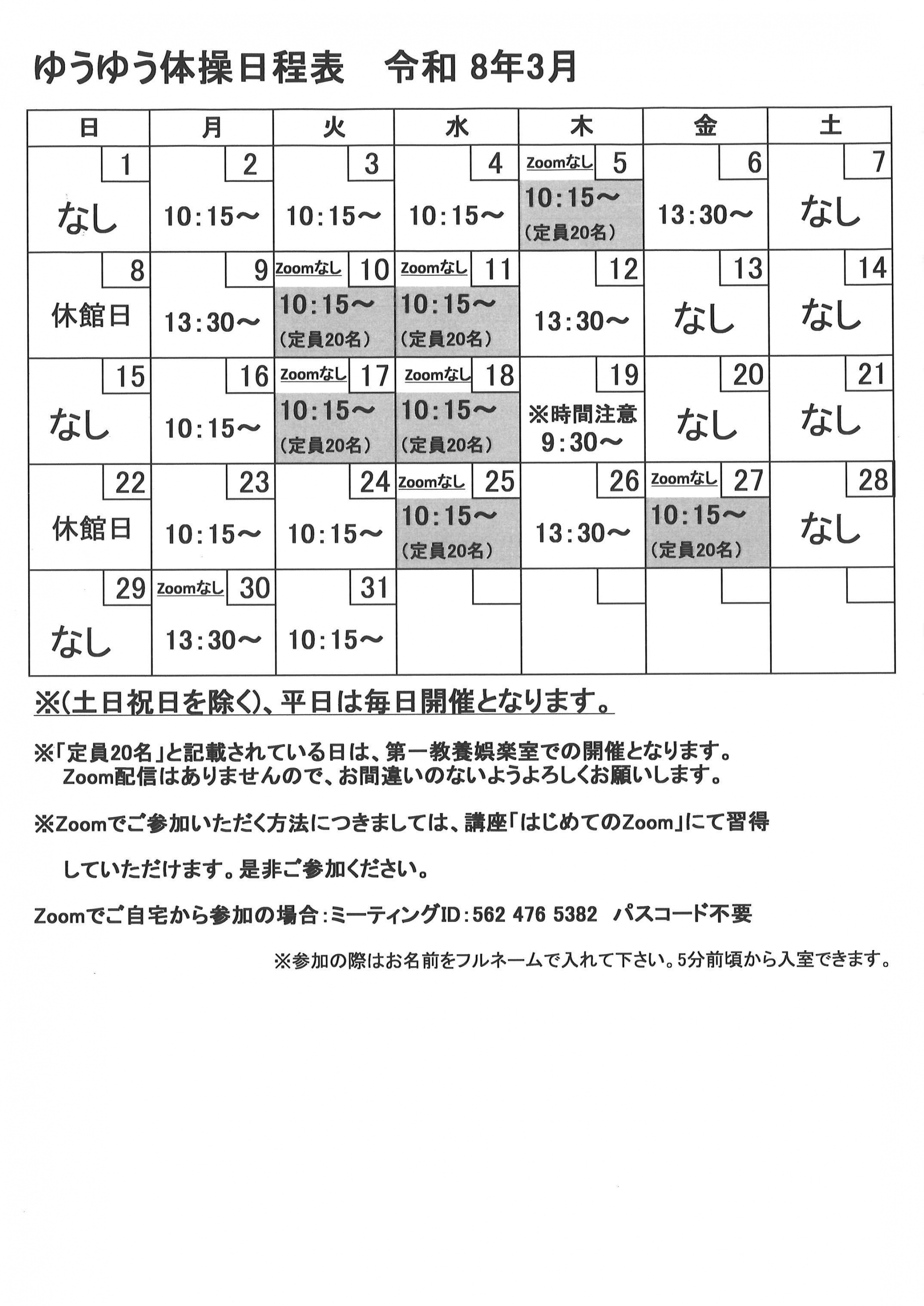 3月開催【ゆうゆう体操、カラオケ自由開放、卓球自由開放】日程表のお知らせです。