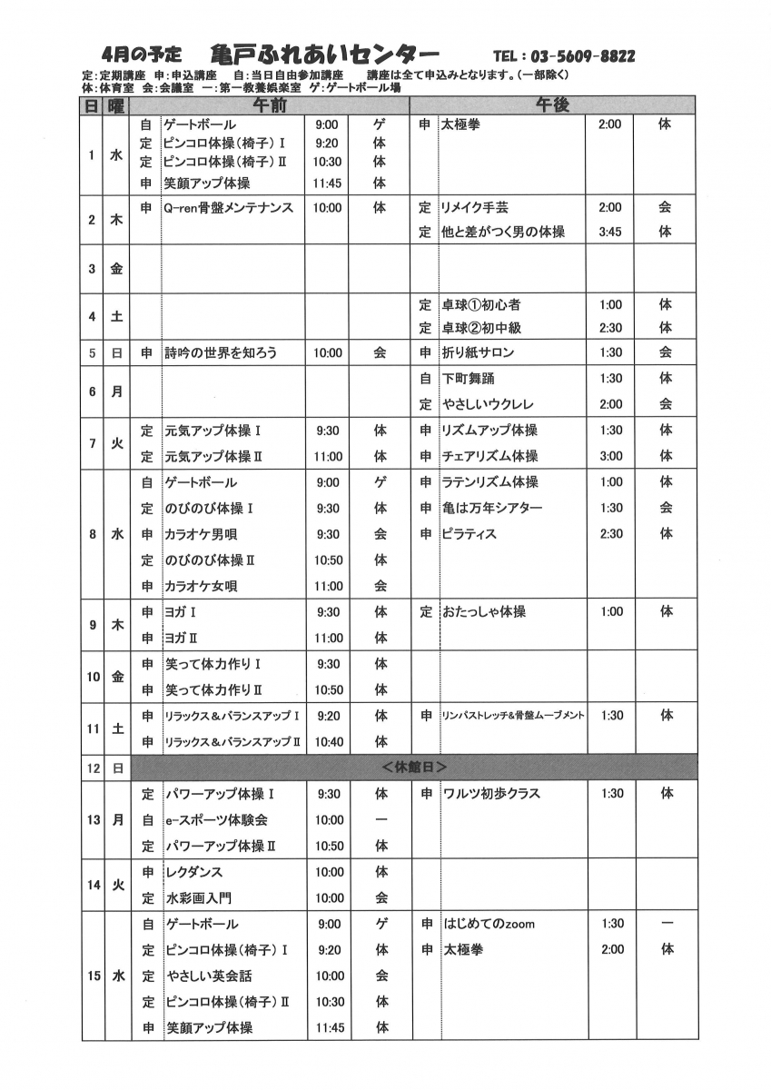 2026.03.25 お知らせ 2026年亀戸ふれあいセンター4月号予定表 Tweet シェアする 2026年亀戸ふれあいセンター4月号予定表が完成しました。 亀戸ふれあいセンター F.A 前の記事 2026.03.26 お知らせ 4月自由参加日程表【ゆうゆう体操、カラオケ自由開放、卓球自由開放】 次の記事 2026.03.25 お知らせ 2026年亀戸ふれあいセンター4月号おたより 一覧へ戻る