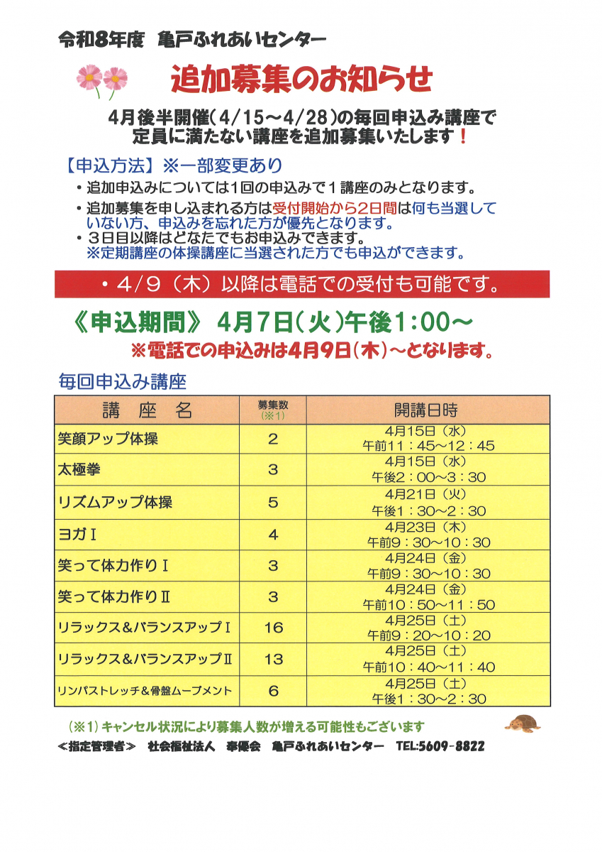4月後半開催の毎回申込講座で定員に満たなかった講座の追加募集を行います。追加募集する講座は以下の講座となります。