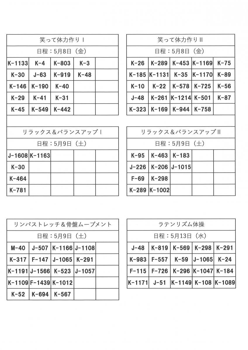 その1では、リズムアップ体操、チェアリズム体操、笑顔アップ体操、太極拳、Q-ren骨盤メンテナンス、笑って体力作りⅠ・Ⅱ、リラックス&バランスアップⅠ・Ⅱ 、リンパストレッチ&骨盤ムーブメント、ラテンリズム体操、ピラティス、ヨガⅠ・Ⅱ (開催順)の結果を発表いたします。