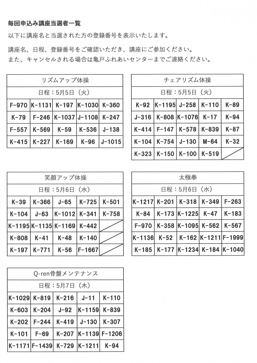 5月前半開催の毎回申込み講座の当選発表をいたします。