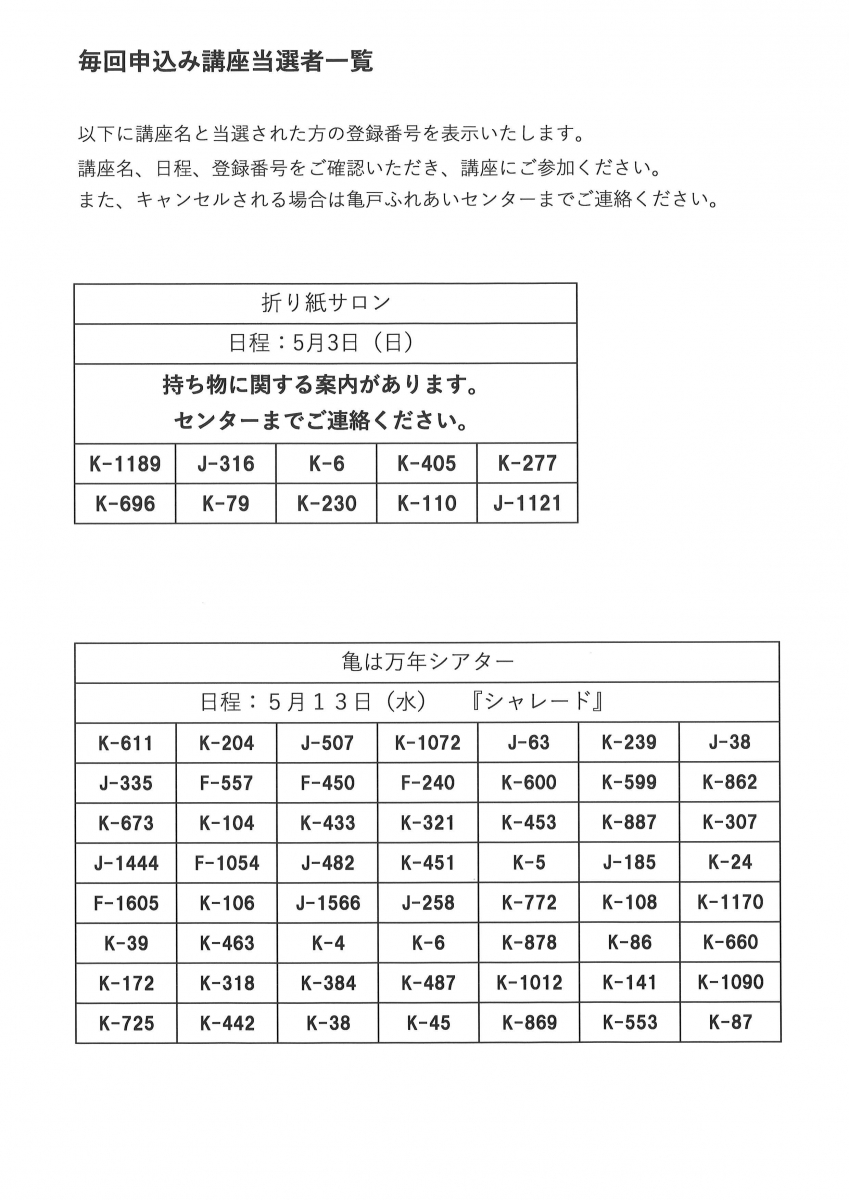 5月前半開催の毎回申込み講座の当選発表をいたします。