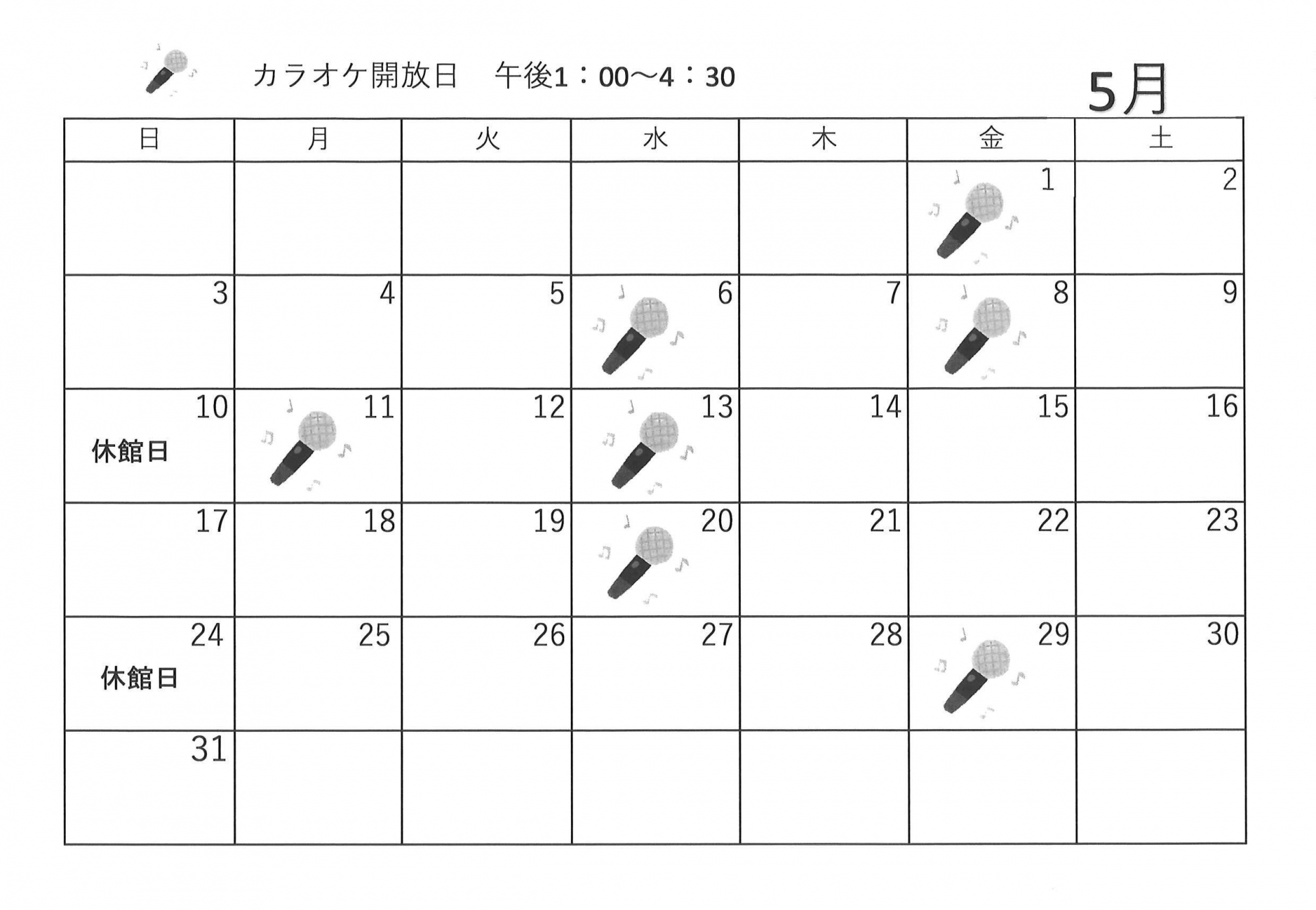 5月開催【ゆうゆう体操、カラオケ自由開放、卓球自由開放】日程表のお知らせです。