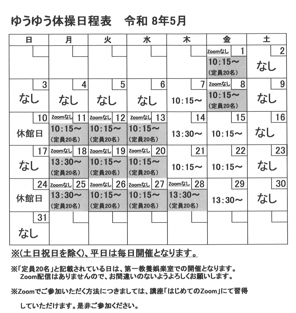 ③お部屋の都合上、第一教養娯楽室で開催の場合はZoomの開催がなしとなりますので、ご注意ください。