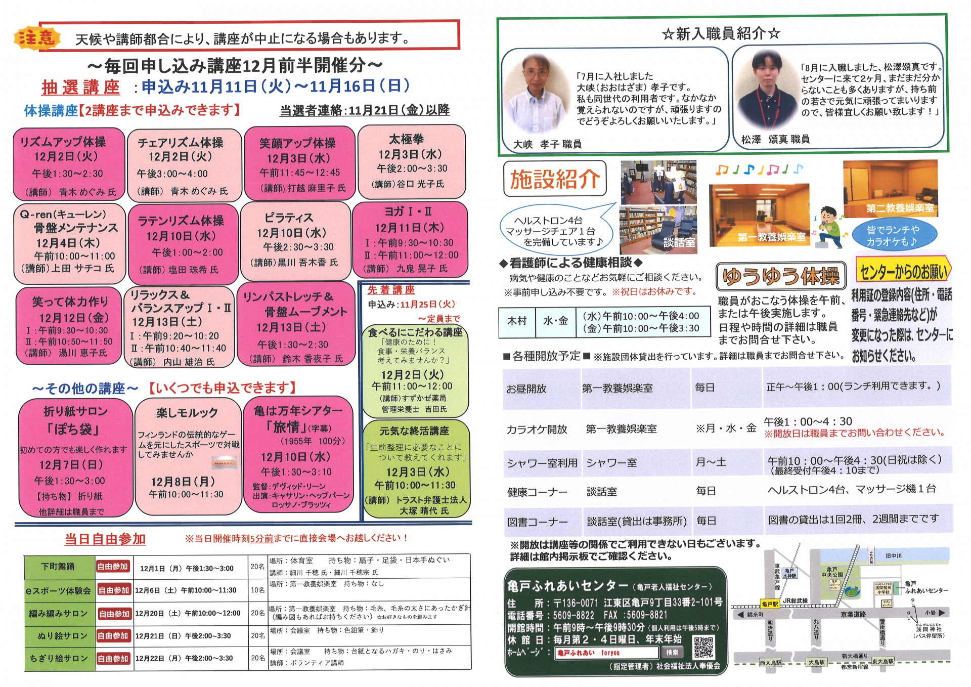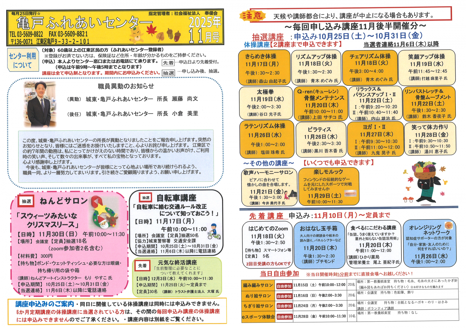 2025.10.25 お知らせ 2025年亀戸ふれあいセンター11月号おたより Tweet シェアする 2025年亀戸ふれあいセンター11月号おたより完成しました。 ↑印刷をしたい方はこちらをクリックしてPDFファイルを表示させてください。 一覧へ戻る